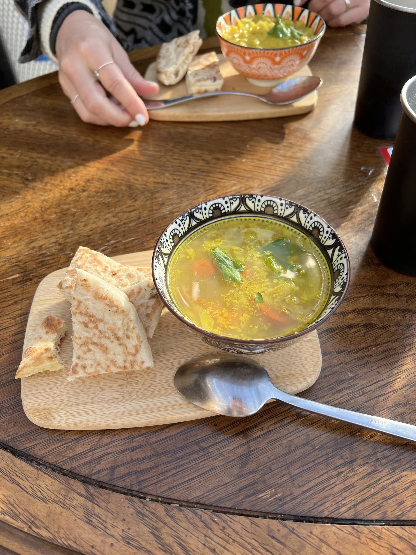 The food was so delicious. I asked about the soup of the day and Manny said give me a second I don't know the best way to explain it. He leaned through the window to the kitchen and asked Koby how to explain it. Yes Koby was in the kitchen cooking at Koby's Creekside Grill. I loved that. Koby leaned out the window and said something along the lines of "it has vegetables in it, broth, and spices. I don't know how to really explain it besides it's delicious. You should get it, you won't be disappointed." He was right, we weren't disappointed. My significant other and I both got the soup and the chicken pargeiot pita sandwich. The soup was in fact so delicious it came with some pita to soak up the broth. I really wouldn't know how to explain it either but it was fantastic. The pita sandwich was delectable. The sandwich was so pretty and appetizing with all of the veggies and chicken stuffed in it. It was one of those meals I wish I could eat over and over again. We left feeling full and satisfied.