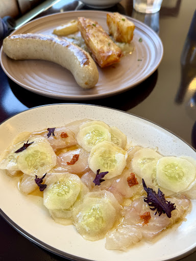 We tried the California Cured Halibut—fresh, balanced, and the kind of flavor that makes you want to order a glass of white wine on the spot. The Weisswurst was also memorable, though it was the crispy potato cake on the side that truly stole the show. Portions are on the smaller side, and the prices lean high, but the quality and creativity really justify it.
