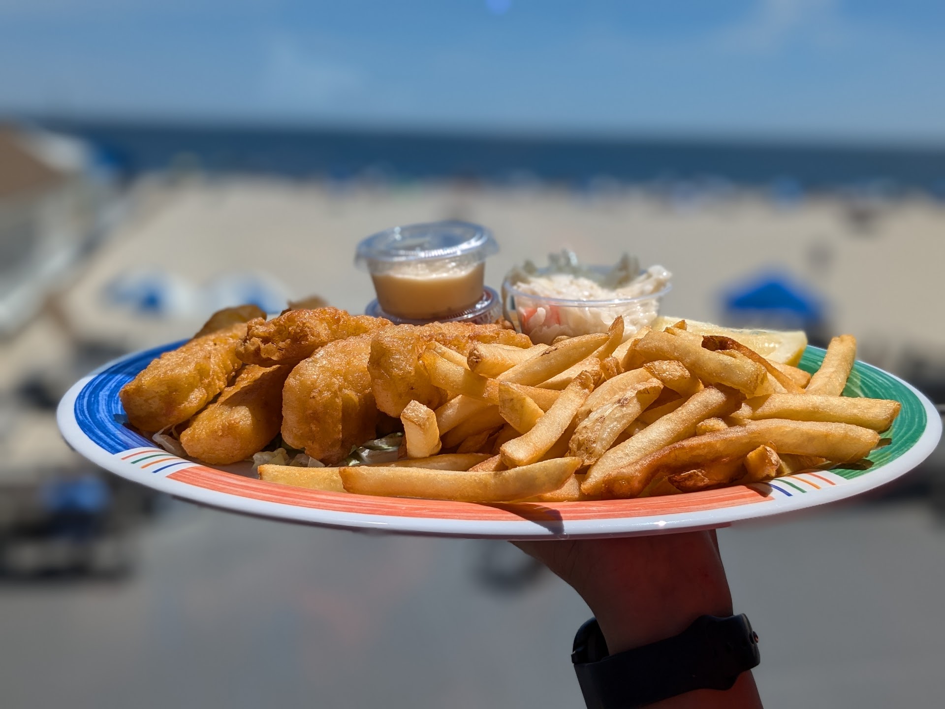 When I came to Pt. Pleasant as a kid in the 80's and 90's, we always ate at the restaurant across the way. But now with a more refined palate for food besides pizza and cheesesteaks, I suggested to my group that we try Boardwalk Bar & Grill. We looked at the menu and were satisfied with the options. The person at the front desk explained the difference between upstairs and downstairs - upstairs has a view of the beach, downstairs had certain drinks at half price (for lunchtime on a Wednesday). None of us were drinking, so we took the view! The view is great, even if the left side of the view of the beach and ocean is blocked by the restaurant across the street.
