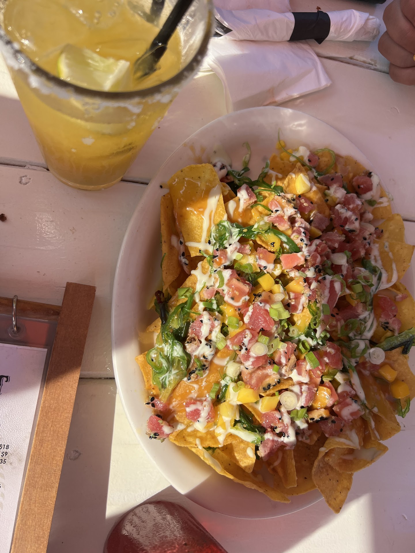 The upstairs wasnāt yet opened but that didnāt stop the amazing hostess from getting everything set up for us. Orange crush and margarita to start. Followed by the best battered fried cauliflower Iāve ever had. And my partner went with the ahi tuna nachos. Also incredible.