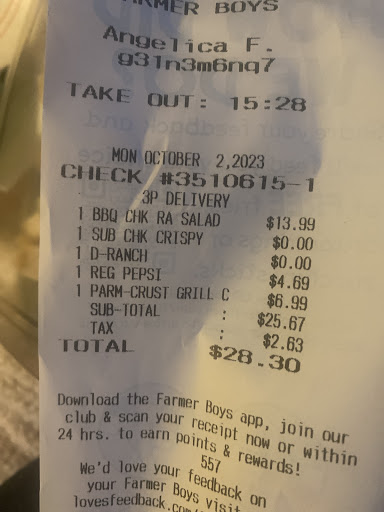 Ā Ā Ā Read moreI ordered for delivery and to make a long story short I ordered the bar-b-q RANCH salad. I order this every single time I go to Farmer boys and itās always beyond great. I order it specifically because the ranch is just the best and topping my salad with that ranch is my whole purpose because without the ranch the salad is NOTHING! Well I got my salad but NO RANCH!!! I double check my receipt to make sure it wasnāt an error on my end and right there it says 1 Ranch, look in my bag one more time and turn it inside out even and the only thing that falls is the lonely bar-b-que cup filled with bar-b-q sauce, NO RANCH! Iām not a complainer I swear but this warranted a complaint. Do you not read your orders or the title of your salad. I mean itās called Bar-b-que RANCH chicken salad. You sent the bar-b-que sauce that I did not ask for but not the Ranch I requested. If I could give less than one star I would because now Iām stuck with a salad with no ranch. Itās like drinking kool -aid with no sugar. Luckily I ordered a grill cheese. I never order anything else but I guess I somehow knew something would happen. Thereās my receipt and on the 3rd line is the ranch...