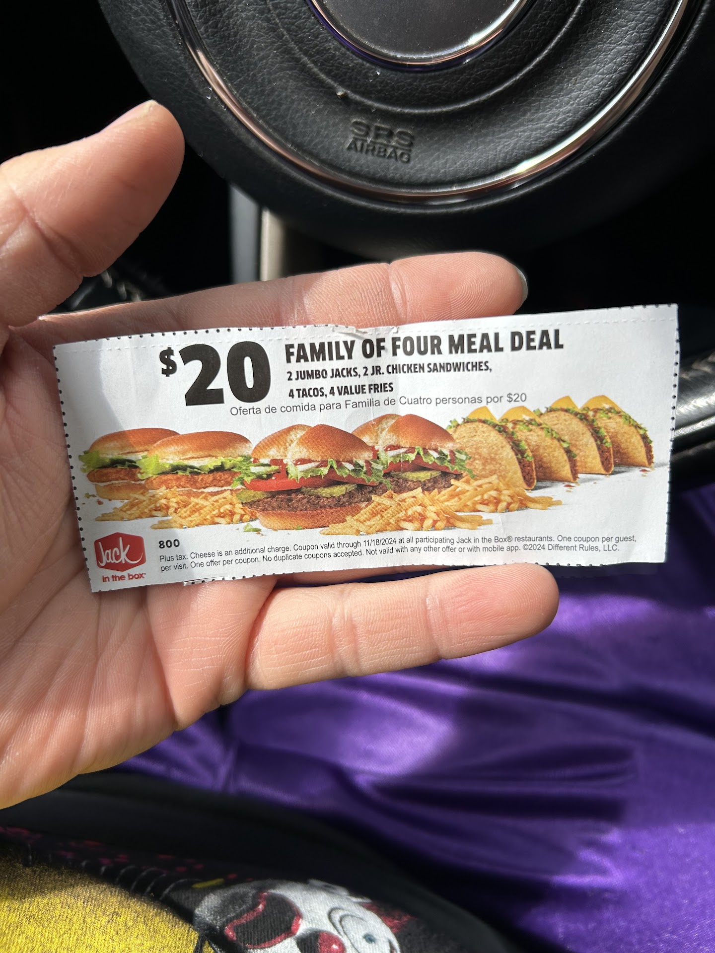 Ā Ā Ā Read moreThe magnetic strip on my debit card doesn't swipe. The cashier was unable to enter the digits without a managers password. The manager claimed to be too busy to allow permission yet had the time to ask the cashier to retry, ask me if I had another method to pay, and then cancel the order. I've seen videos online of handheld imprint swipers from the '80s where no strip was needed. In 2019, niether the computers nor the Jack in the Box staff know what to do when this relatively common situation occurs. Chip readers came out years ago eliminating the magnetic stripe issues but JitB doesn't think 95% of all other businesses are on to something by using them. The pic is from my driver seat as I sat parked in the parking lot writing this review. It kind of sets the scene for the rest of the experience here....