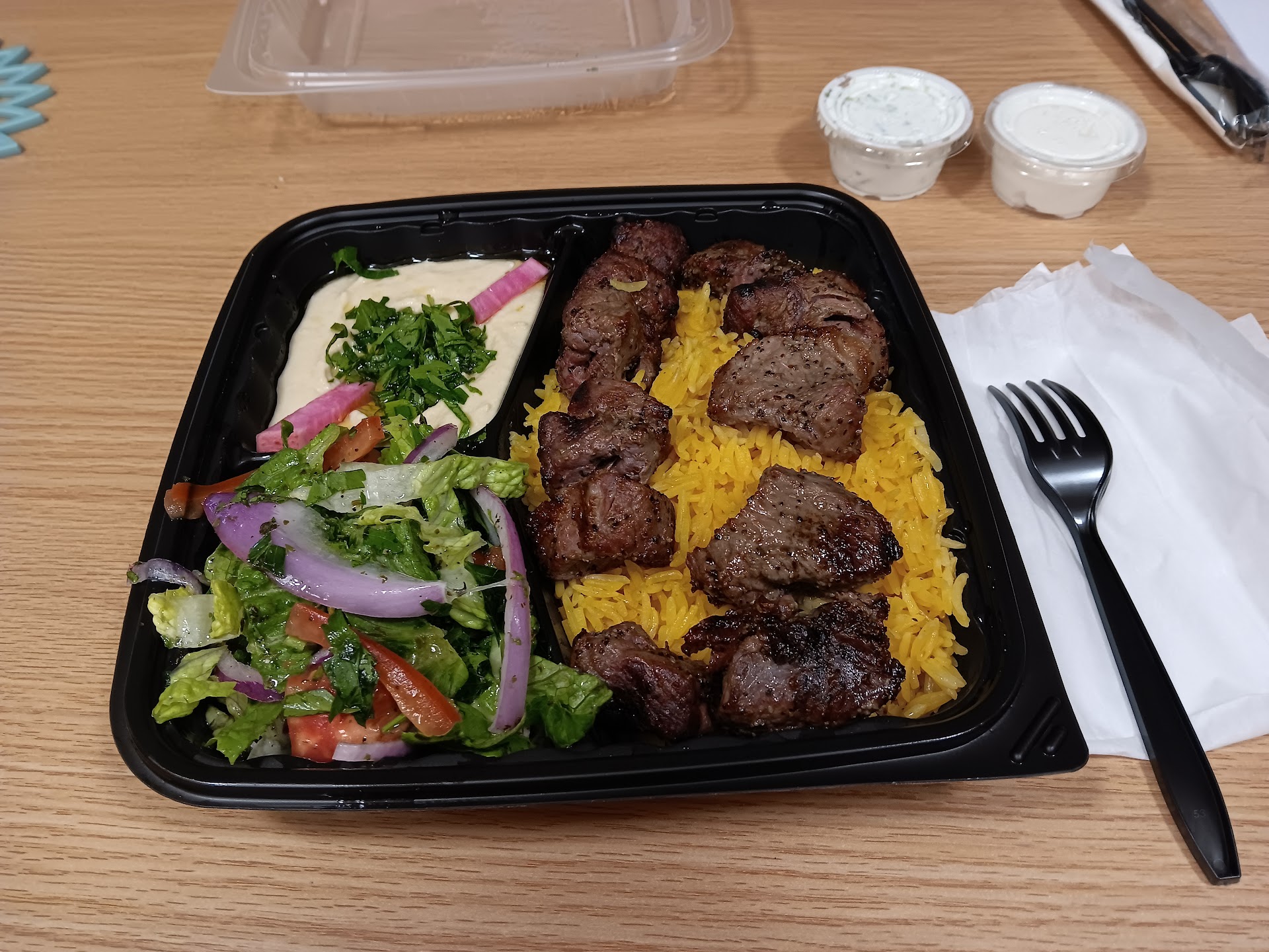 I was JUST telling my husband a few days ago I wish we could find a GOOD Mediterranean food spot…I LOVE mediterranean food and have a high standard when I try new spots of mediterranean food. This was absolutely delicious! We got two beef kofta combos and a beef shawarma. We waited maybe about ten minutes for our food. It was fresh and hot! The beef was seasoned to perfection, juicy and so savory, their hummus was so good, the side salad was also so refreshing, citrusy and pickled we loved it! My husband LOVED his beef shawarma wrap, it reminded him of his favorite Mexican meat Al pastor cause of the seasoning, I mean that in a good way! The food was SO good my husband didnt eat it all so he could enjoy some more later which we did! We spent the rest of the afternoon eating our left overs. We will definitely be back for more! Good food, calm atmosphere and great service!...