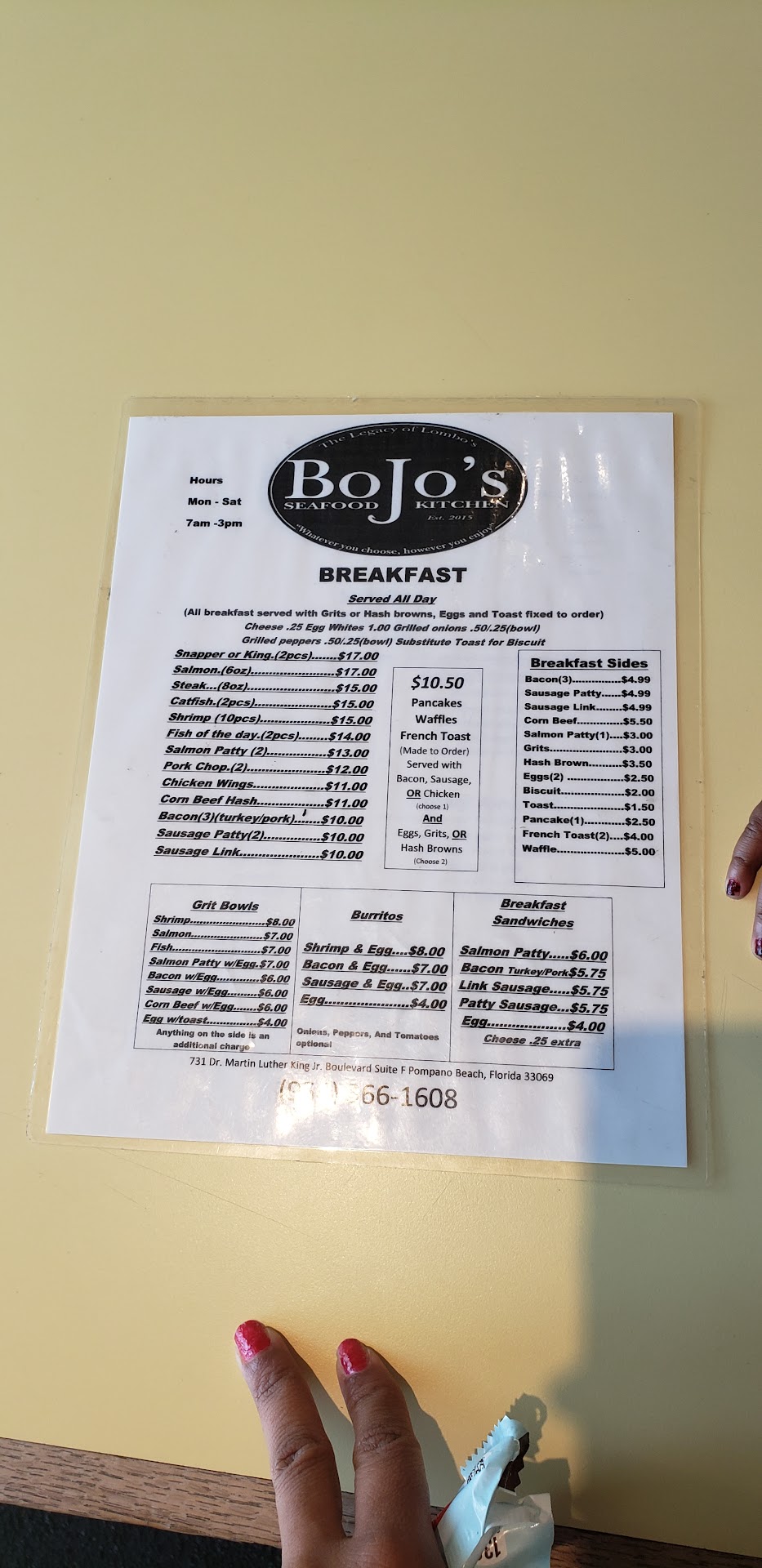 Read moreThis was my first time at this location a huge, thank you too Meechy you have excellent customer service skills and you’re very patient because I am definitely a picky eaterthis place was recommended to me by a friend and they are definitely worth the hype I wish I can give you guys 2000 stars. Bojo’s is nice and clean and don’t even get me started with the food I ordered salmon with grits and eggs and when I tell you a 20 out of 20 i’m definitely a regular here now and I will be Recommending you to all my family and friends your food is definitely chef kisses and I love how everything was well organized on the plate. The presentation is A1 thanks again see you soon! Ps you have to try their homemade cake and also their homemade...
