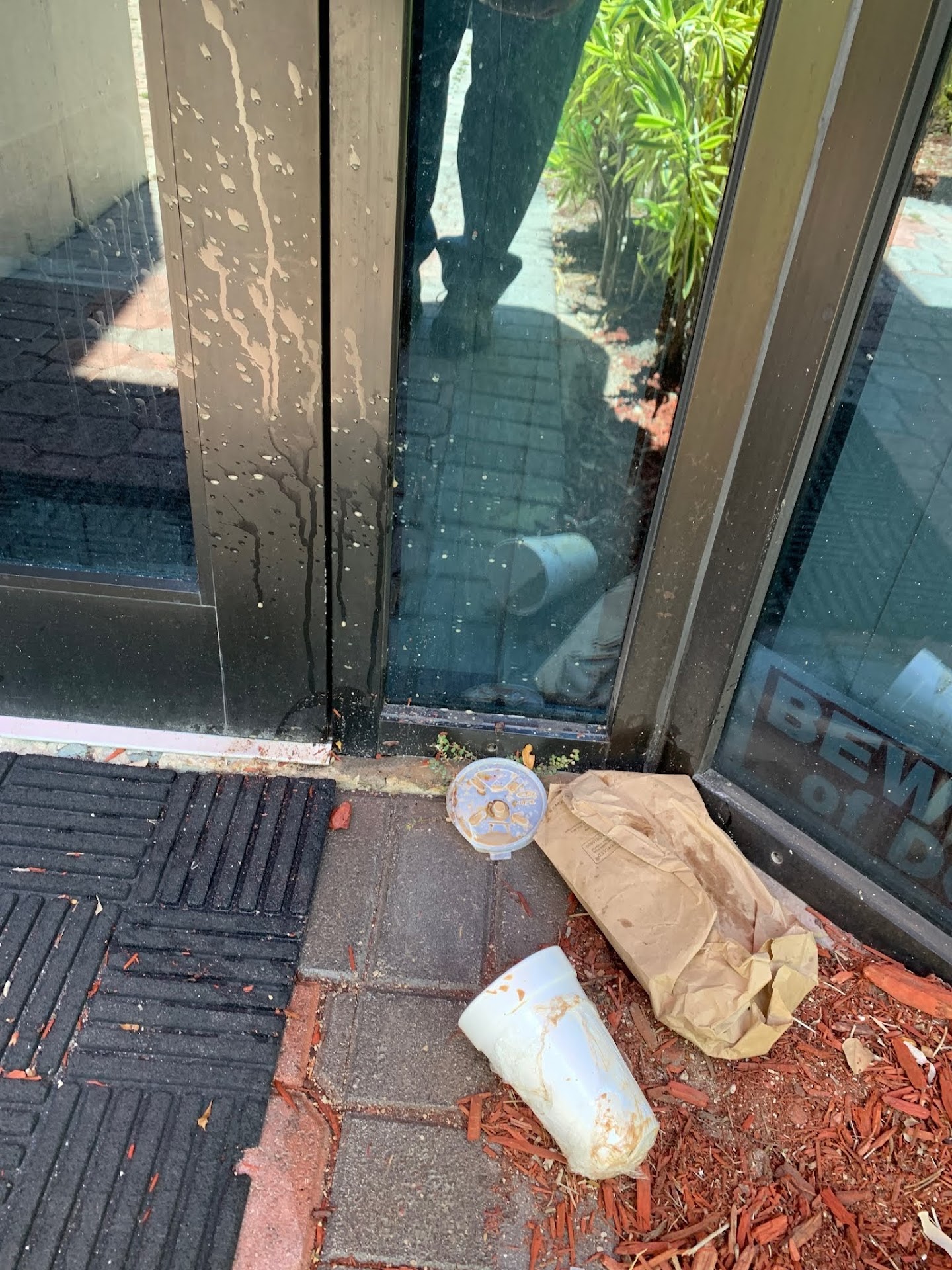 He realized he wasn't getting anything from us so he exits our building and threw the drink and food at our office door and leaves. Are you serious? All this chaos over less than $5 cost of food and packaging material?