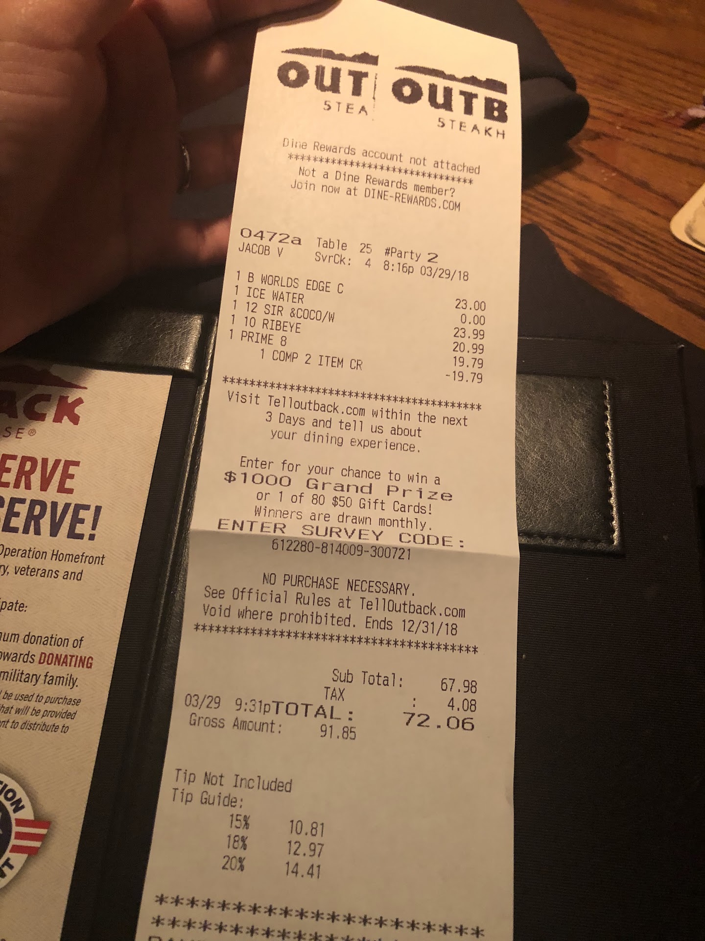 Ā Ā Ā Read moreI came in at 8:20pm March 28th, 2018 Ordered a primerib (medium-rare) when my food arrived, my medrare was medium looking medwell, the waiter offered to change it so I agreed. Then brought the same plate with the excuse that is was too late for a med-rare and if I wanted a med-rare I should have come in earlier. The chef also came out and offered a ribeye. I agreed, and it was cooked the right way. Meanwhile my boyfriend is almost done with his food, we had already drank more than half the bottle of wine we ordered. When the check comes they comp the primerib $19.79 and charged me for the ribeye $20.50 (i believe) is not even $1. Difference, but is not the price that matters, it the lack of customer service and the time I wasted. While my boyfriend was eating I was looking at his food HUNGRY because my waiter didnāt even bother to check if they had prime rib med-rare left and then had the nerve to tell me to come in early if I wanted med-rare. Are you kidding me???? This was a horrible experience and you are going to charge me full price for en even expensive meal than the one I ordered when it was your fault for not checking what I wanted was available. (It doesnt matter it was $1. Difference is the matter of the fact) NO customer...