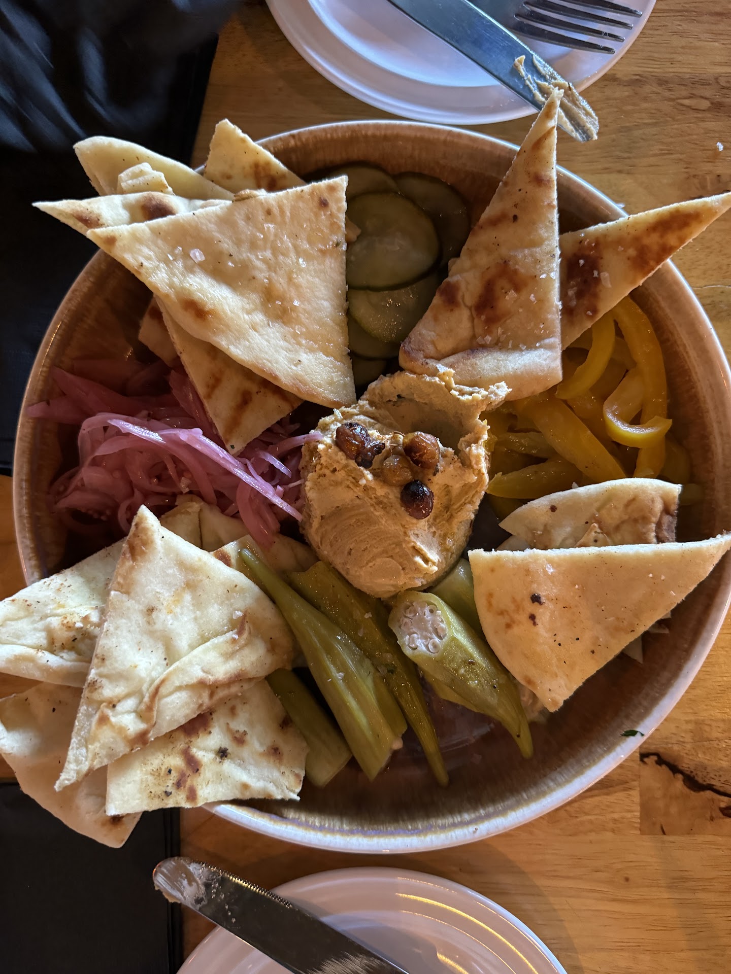 I was so impressed with the Fun and relaxed decor and all of the employees are super friendly and knowledgeable. I had a hard time picking what to eat bc so many dishes sounded Delicious! I ended up with the Killer Chicken and my friend had the Beef French Dip. We shared the pickle platter which was Great. I’ve had a lot of chartreuse platters and this one did not disappoint! From pickled okra to , pickled onions and spicy pickles. With a delicious hand made hummus and warm freshly salted pita bread!!!