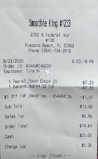 Read moreI came into the store upset from life experience. I was greater by both Amyâs and Terrance. They were both very cheerful and helpful when I was having trouble making a decision on which smoothie to get. Whenever I come into smoothie king I always get the same smoothie- a 32 oz banana boat. But today they gave me so kindness and patience when I was making a decision and asking question on how I can modify the smoothie. The got the Berry treat, but added kale and substituted collagen. It was deliciously hydrating, and thick just how I like my smoothies. I left the location feeling more cheerful because of their kindness. It gives me hope knowing that there are genuine kind people in this world after having an encounter with both Mya...