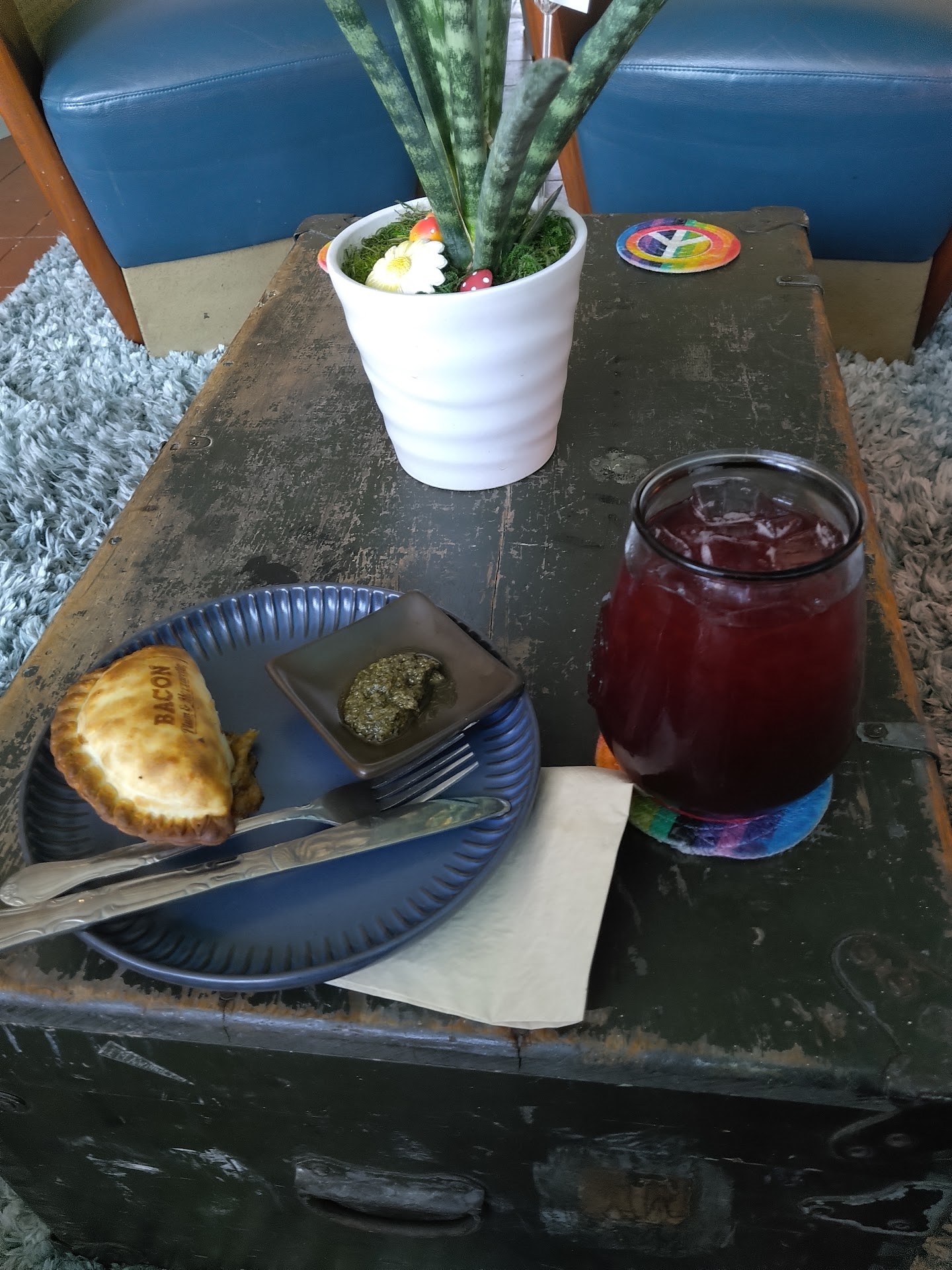 The best decision I made all week was coming to this adorable cafe. The owners were so friendly and gave me a tour of their incredible salt cave room, which I can't wait to go back and try out. I had the most delicious bacon & plum empanada with a blackberry lemon mushroom drink. Their dog, Ocean, set the tone for the most chill vibes. The decor, atmosphere, food & drink were just perfect. I grabbed a book from their little library to read while I ate. I also snapped a picture of their event calendar because it seems like they always have something fun going on. 15/10 would definitely...