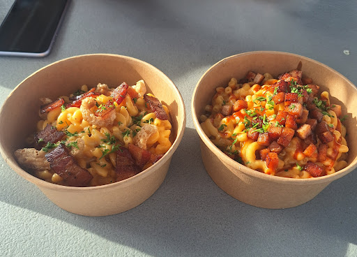 Very good mac and cheese! I got the one with spam and the one with chicharrón. So delicious. Creamy and well seasoned cheese sauce. The truck sits in a space with cute seating and next to a truck with a full bar. Volveré para probar las...