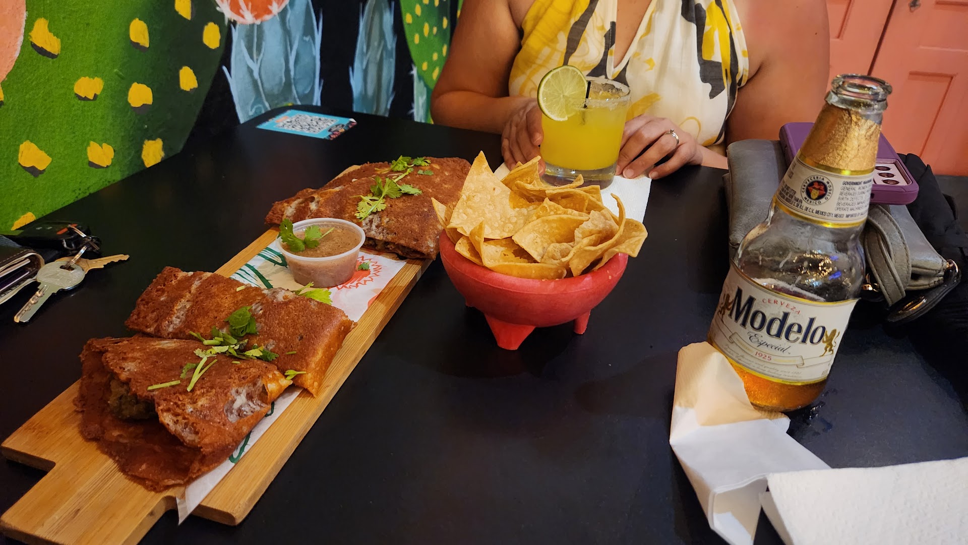 Read moreThis was a wonderful experience to have in Puerto Rico despite it being Mexican food! I myself am Mexican from Florida and I was excited to be able to order a margarita and maybe some tacos. We walked towards the establishment and we're told that they wouldn't open for another hour. Seeing that we had a party of 15 they said to give them 30 minutes and they would have everything set up for us. They kindly let us in early and put together all the tables so we could fit. We only had one waitress and she worked her butt off! She took all of our drinks and we love them so much we kept ordering different kinds. The queso fundido deal was very good with the chips and then she actually brought out food for us to try in a little cup because we were indecisive about what to order. We end up going with the chicharrones in salsa verde! There was also three orders of chilaquiles Verdes and lots of tacos. Ultimately everyone was stuffed and there was definitely left over! Every single drink we ordered was amazing from the spicy Margarita to the Paloma. I know you could buy beer but you should definitely try their specialty drinks. Again, I don't know how the waitress did that all by herself so gracefully but she did so and it might have been one of our better experiences out of the 4 days...