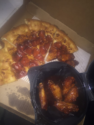 We waited at least 30 minutes for our order AFTER the screen said it was ready. By the time we received our food, it was dried out and barely any toppings. The wings "sauce" melted completely off. Paid about $55 for hard, cold, crusty pizza. The manager was going to give us a discount for cinnabons that we didn't have. When I told her we didn't have any of those, she took my receipt to go find my order. She came back with the other 2 pizzas. The other pizza and wings were in the warmer up front. When I asked her about a discount, she wanted to know what was wrong with my order. How long were my other pizzas just sitting back there? Everything was dried out and disgusting. No one wanted to eat it. It taste like card board and they weren't even cut all the way through. She said she couldn't give me a discount or refund, but she could give me a credit. I don't even know how much it was for or if it even went through. I paid in cash. She said it is connected with my phone number. I'm not satisfied. We will never be back to...