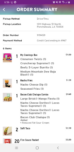 However, the Staff are ususally pleasant and friendly, and the Managers (or at least one Manager there specifically), is pretty understanding. I had wracked up $2 they owed me for being over charged (due to a mobile app issue)), an entire nachos bell grande box with customizations about a $10 order (because they ran out of nachos+I ordered 2 bean+rice burritos with red sauce and cheese (about $3 bucks), which they then made with MEAT, they were Bean+Rice Burritos! They werenât even supposed to have meat!!), and For being over charged for 2 Extras that werenât added to my order($0.30+$0.30), but I was charged for according to the receipt...The understanding Manager, supposedly left a note to take care of it with the next shift Mgr..which resulted in me just getting a Taco Salad with guac & rice (cost=?), and a Mountain Dew Blast Freeze Large, FREE...An even trade considering the amount I was owed? $2.00+.30+.30=$2.60+$10 Cost for Customized Nachos Bell Grande I bought via Mobile only to find they were out of Nachos & couldnât make so instead I only received 2 bean+rice burritos, which were made with Meat so I couldnât eat, I SERIOUSLY doubt it. Oh, and I got the non-freeze version of the drink..rolls eyes
