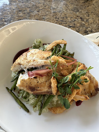 For my main course, I ordered the pan-seared grouper, which was exactly what I’d been craving. It came with pesto rice, crispy fried onions, sautéed micro green beans, and a smoked beet BBQ sauce that tied everything together in a way that was both inventive and grounded in Southern coastal flavors. The grouper was cooked to perfection — flaky, moist, and full of flavor.