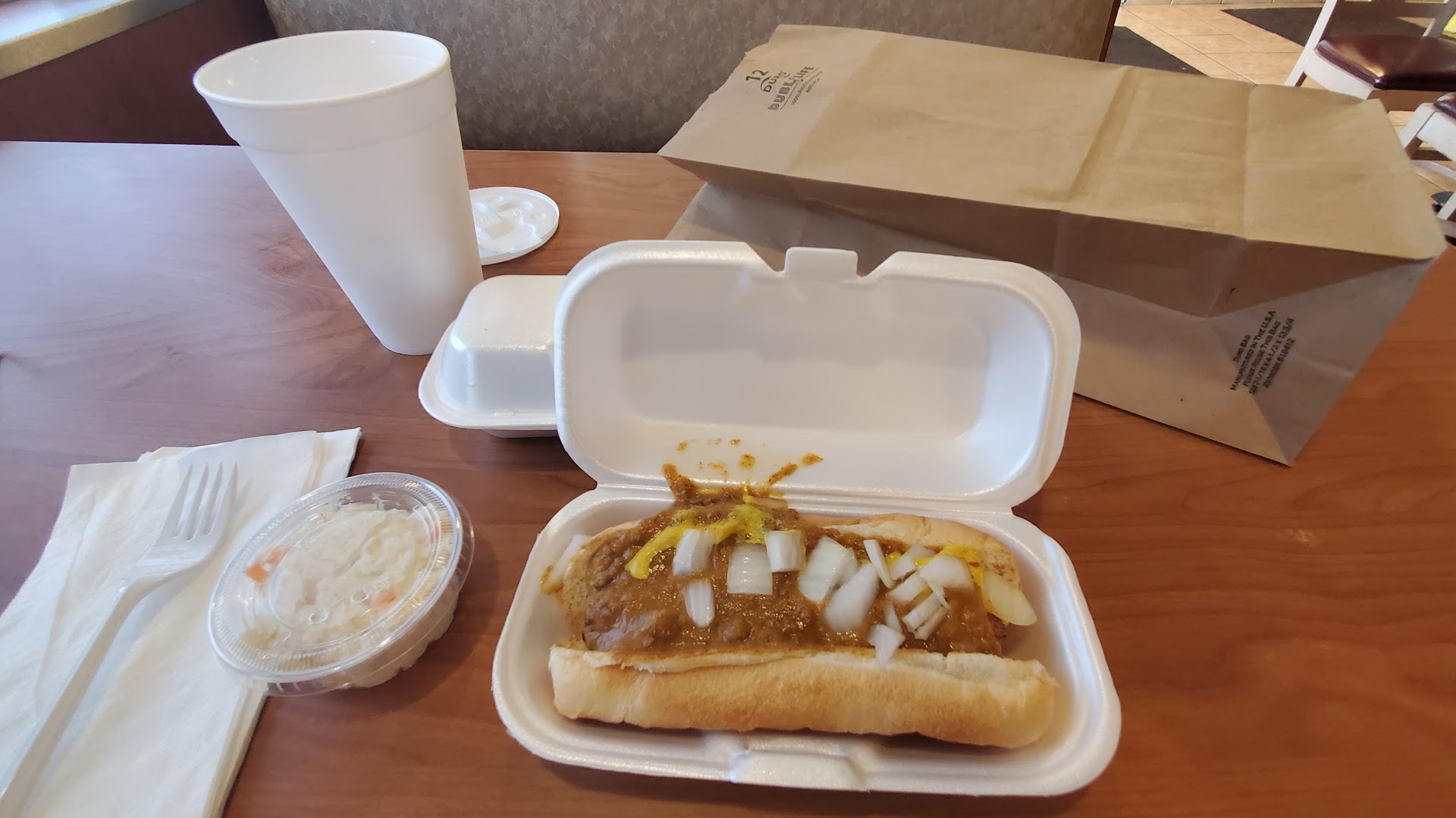 A rainy, gray, spring day just screams for comfort food. So I located the closest Coney Island because chili is most assuredly a comfort food. The server greeted me warmly as soon as I entered and got my menu and drink order immediately. With every interaction she had a legitimate smile on her face. Love dealing with people who enjoy their work. A couple of coneys ordered and some slaw to go with. Coleslaw was creamy, sweet, a little under seasoned, could've used some pepper or poppy seed. Quantity isn't great for $2 but decent. Coneys are good, hot, soft steamed buns. My only complaint: everything is served to go even down to the brown paper bag. And all the containers are plastic...
