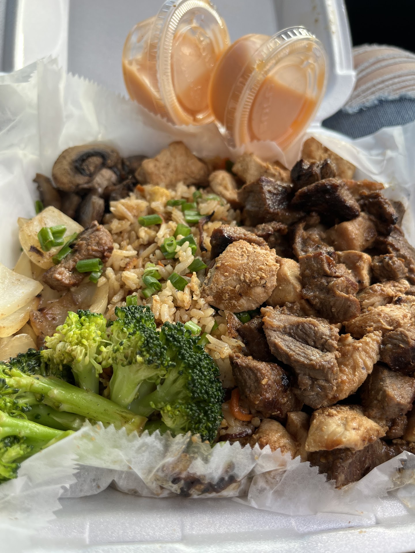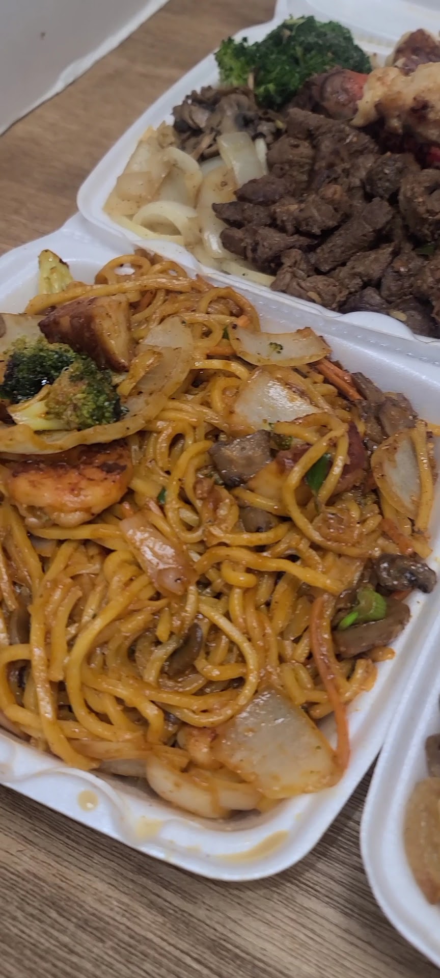 Inside seems nice and laid back. Food IS NOT COOKED IN FRONT OF YOU. So I don’t know why for two chicken and steak meals with yum yum came out to be $75.00. The best part of the meal for me was the combination of fresh vegetables. Rice was dry, almost fully white after digging in, so no flavor or soy sauce applied throughout. Chicken and steak just seemed overcooked or too tough. This food was just Flavorless and OVERPRICED. I was able to eat the vegetables and try everything without the terrible, very thin, yum yum sauce provided before THROWING AWAY my $30 “worth of food”. My boyfriend paid so he made sure to eat majority of his. 🤧 I DO NOT RECOMMEND THIS...