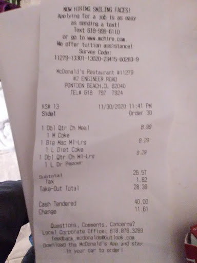 Read moreThere's a lot wrong with this place, you'd think there would be a break in bad customer service between the crews, but no, they are both impressively, and consistently bad no matter what hour you try to get your food. January 28th I went to McDonald's to try and get me some breakfast, boy was that a bad idea, 1, I asked for two big breakfast w/HOT CAKES, one switch out the meat for another hashbrown, I get home and I look in the bag, and no pancakes in one order, no big deal, I call up there to tell them my issues, and they straight up told ME, the customer, that I said no hotcakes in one breakfast, that was never said, we went back and forth, not getting loud, but then the lady on the other end started screaming at me on the other end, saying she couldn't accommodate or replace anything in my order; I politely asked for a refund, and she got louder, eventually hanging Up on me after politely asking her to not yell at me, and to calm down. Needless to say I had to go to extra steps with my bank to get an issue refunded on their end because they absolutely refused a refund, this place needs shut down, and needs rehiring on management's end, because I've never been disrespected this badly in my life, avoid this place completely if you can help it, go to granite; or hell even collinsville, because this place isn't worth the headache, by far the worst experience I've ever had; and I'm so glad the bank gave me the refund because I will never spend a dime at this place again! Listen to the 1 star reviews; because this place is really that bad, they don't even deserve a half star...