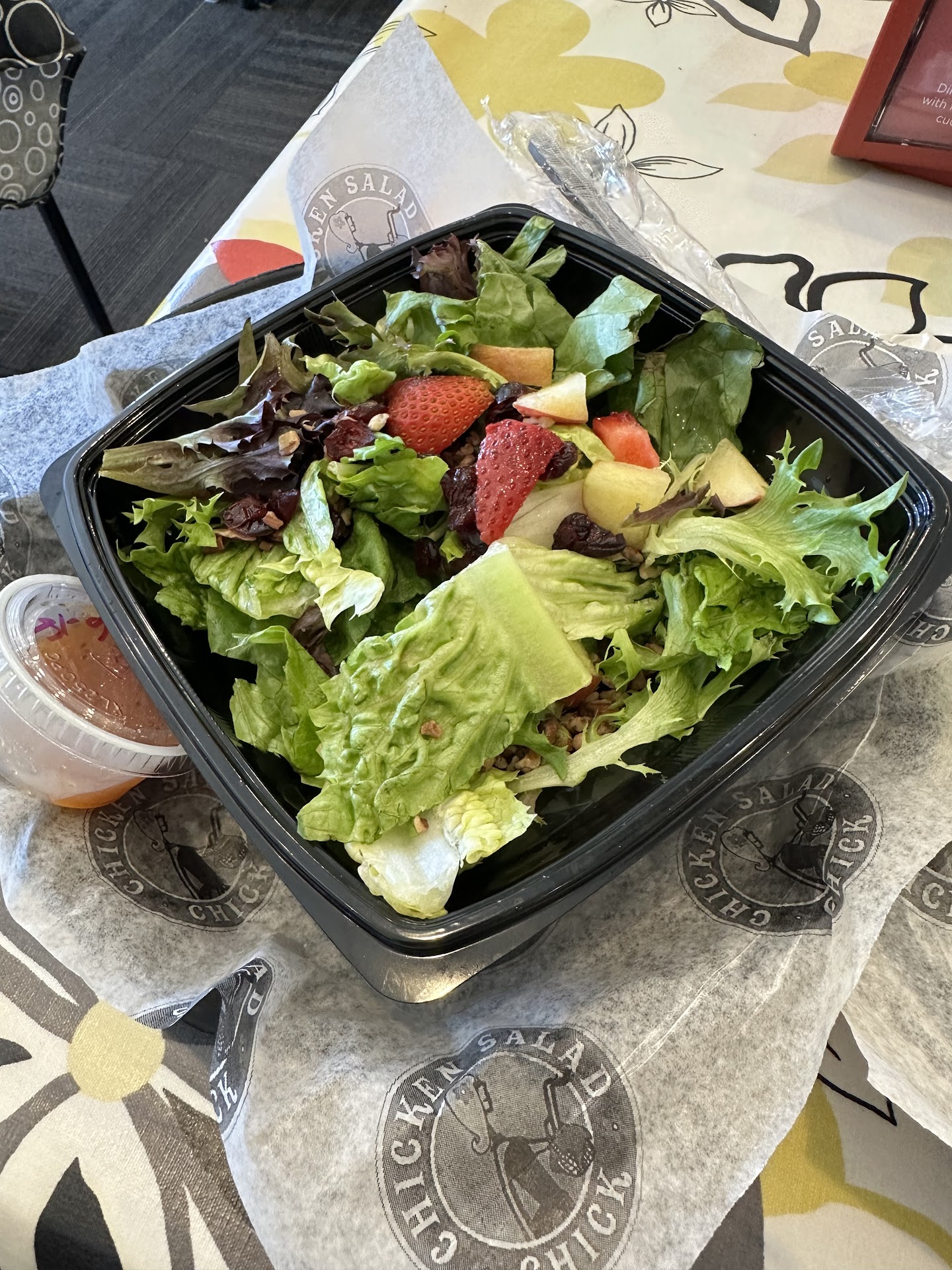 Read moreI've been to many Chicken Salad Chicks and normally not disappointed but this location was unfortunately not one of those good experiences. The young lady I ordered from took my order and read back what I ordered. Which was a trio (fancy Nancy on croissant, broccoli salad, and loaded potato soup.) and my husband order, to go. Luckily we decided before our continued long trip to just eat at a table. I opened my meal and noticed I did not get my broccoli salad. I went up there and asked for it explaining I got the trio and that it was missing. The young girl whom I just ordered from 5 minutes before didn't remember me ordering and gave me 21 questions like she didn't believe me. Even asked for my receipt. Which I happened to throw away thinking I didn't need it any longer. I told her I threw it away and she said "well that's weird it wasn't in your to go order ." I reassured her it wasn't. She finally asked for a side to go for me. I started eating it and after the 5th bite I chewed into a sandy brown piece which I thought was a dried cranberry. Nope it was dirt. I threw it out after that. The chicken salad, fancy Nancy, was basic and barely had any of the extras like apples and grapes. I've never been so disappointment from...