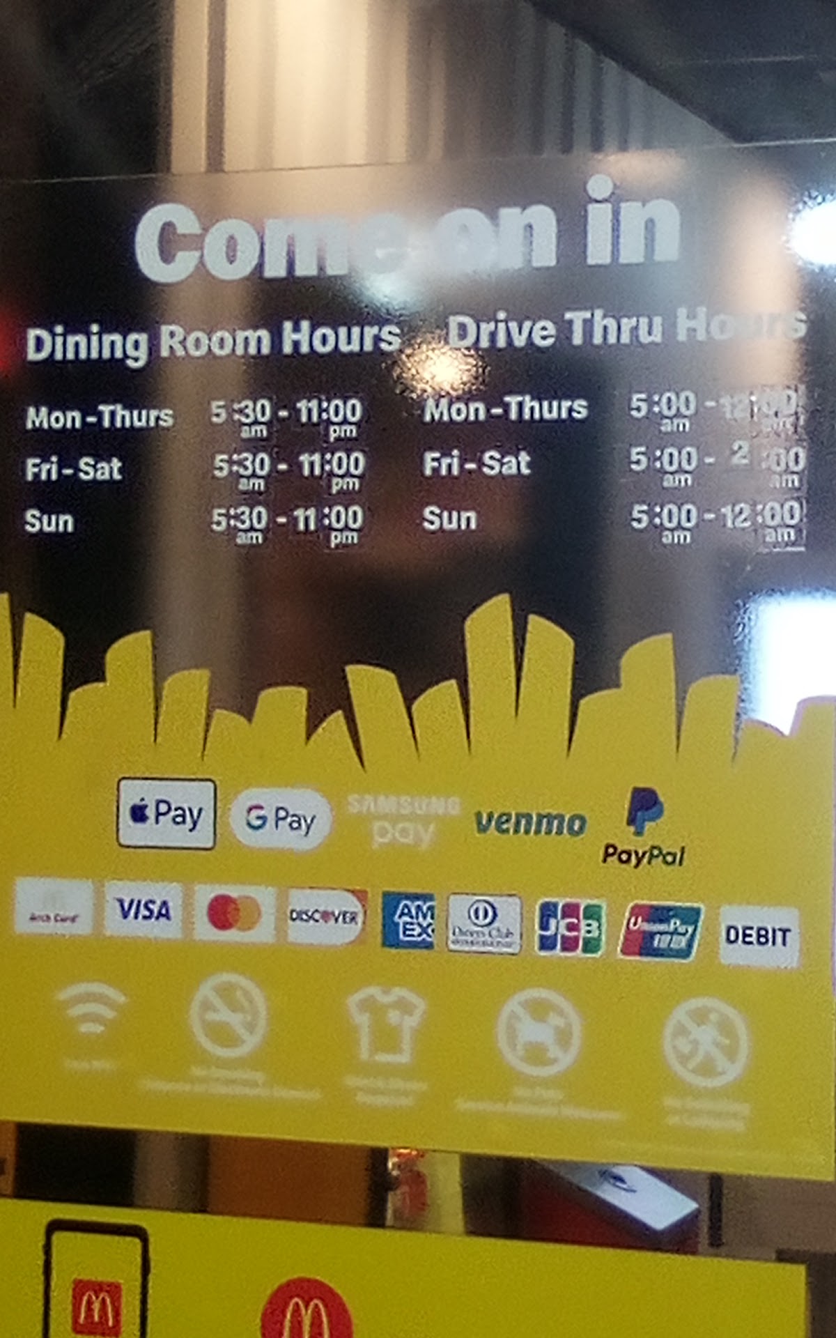 Read moreBusinesses are made designed to make money! How in the world does anybody make money when at 6:21am in the morning your BUSY BUSY MCDONALDS is closed for the dining room!!!! If this was my McDonald's( which it is not) there had better have been a very decent explanation as to why my dining room was not open to the public, people count on it everyday, what about people who are visiting from out of town who are within walking distance and get all excited to go to their favorite restaurant in the morning and can not because employees are to lazy to want to deal with the public. ( Too damn bad, if you don't like IT PLEASE, I BEG YOU!get another job please!!! We want people who are excited to serve the public each day! Ever since COVID these businesses are so lazy it's ridiculous!!! You have a family of 5 eating outside while it's still early and dark,and you see a employee opening the door to inform us there closed for dining room. I've said enough. God bless and have a wonderful weekend!