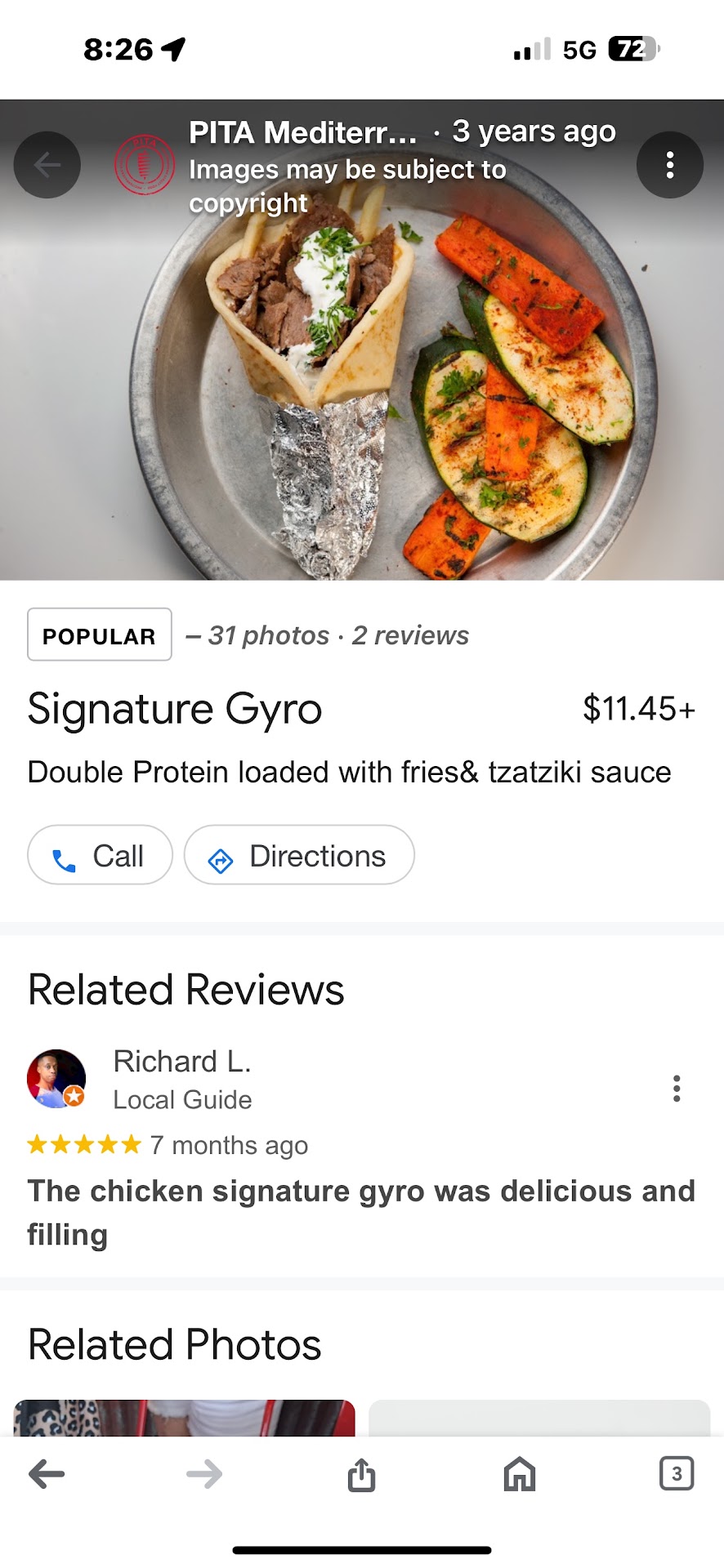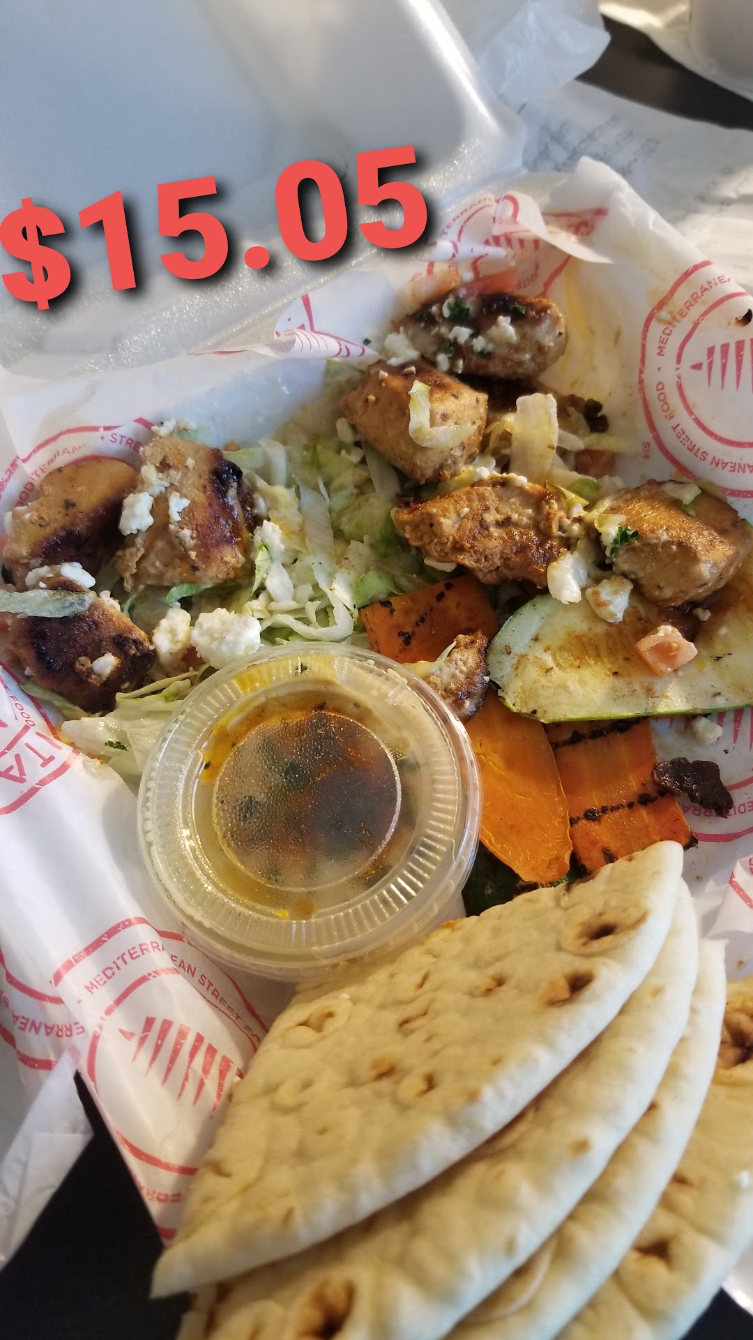 Read moreTastes good, but seems way too expensive for the amount of food on my "Grilled Chicken Platter". Also missing items. I made an online order with DoorDash. When I called the restaurant to ask for some foil to wrap up my leftover pita in, the girl that answered was very nice! She said she would make sure I had some foil (and a plastic bowl) to put my leftovers in (for travel). I asked if the "Platter" came with some pickled onions or something.(I guess it could be pickled turnips in the picture?), she said yes. I said I love those, and give me those for sure. She said "Okay, she would" She was very friendly and trying to be accommodating. I didn't get those either. I don't know if they're supposed to come with the platter and they were left off, or they're not supposed to come with it but she just didn't tell the kitchen that I asked for them. I needed the foil to wrap up the leftovers because I'm traveling, I'm a flight attendant. I didn't get any foil. --- I have a suggestion, when you have a to-go order get the lettuce in a SEPARATE container! My lettuce was all warm and soggy when I opened my order. I want fresh crunchy lettuce. So maybe I should have asked for the lettuce to be packed separately? I will next time. The platter was 7 chunks of chicken that comes with a pita, lettuce, and your choice of two sides - mine were veggies and hummus... That's "a platter"(see picture). The other things I ordered: *a little plastic container (1.5oz) of Tzatziki sauce, a bag of Stacy's pita chips, and an order of Baba ganoush, which also comes with pita. It's VERY expensive to get this food ordered on DoorDash. I paid at least $36 after taxes, fees, and a $3.00 tip to DoorDash. So much money! I think it would have been more reasonable if the "platter" had been...