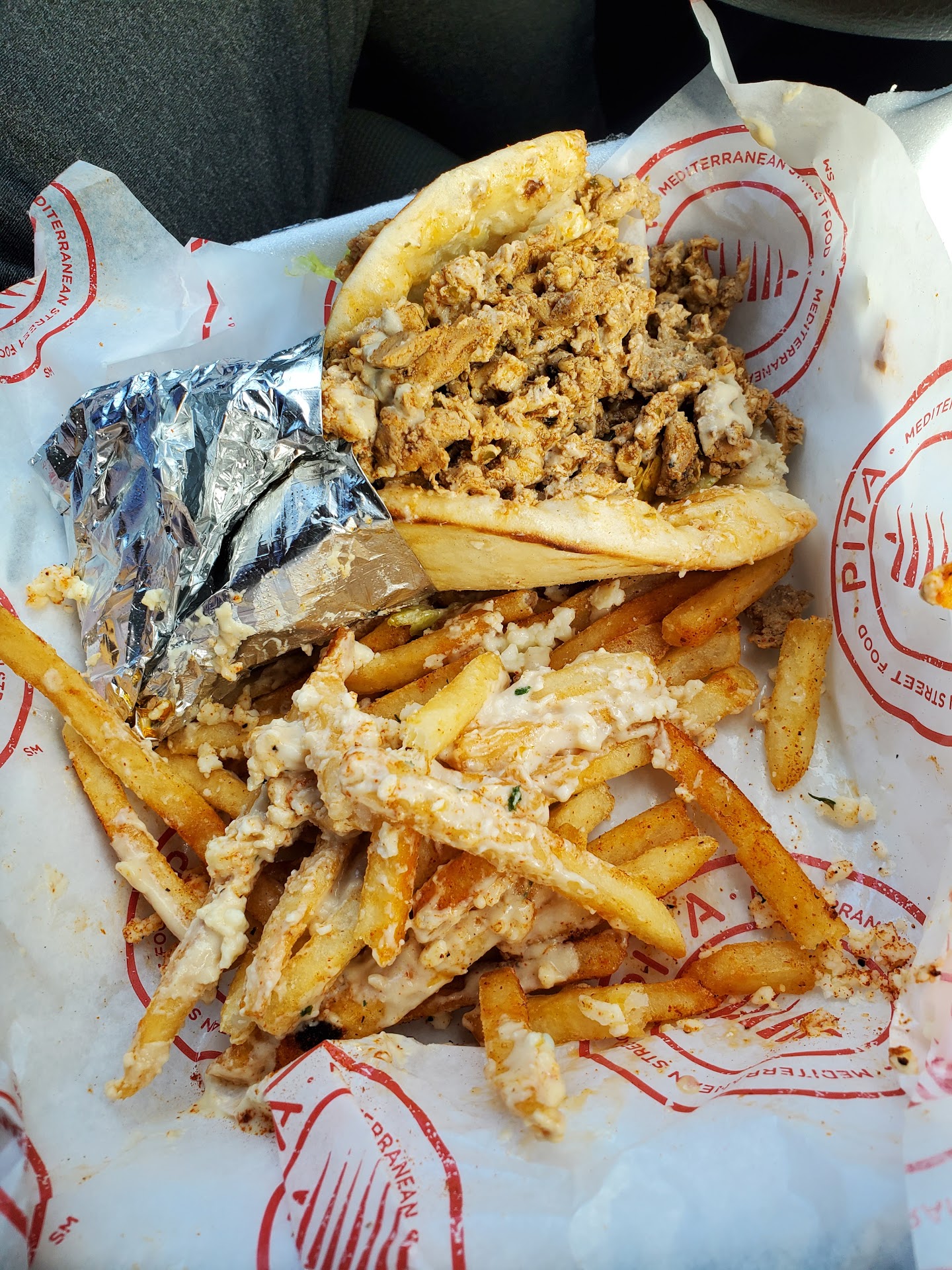 The straight cut fries were mostly uninspired themselves but the Greek fries had them loaded up with the perfect ratio of feta and other lovely toppings that made it an enjoyable and filling side. I believe they offer this as an entree with added gyro which sounds delightful. The pita follows the same trend with the pita bread itself being room temperature and mostly bland but offering a great palette for the pile of tasty meat, onions, tomatoes, etc perfectly wrapped in its foil cone.