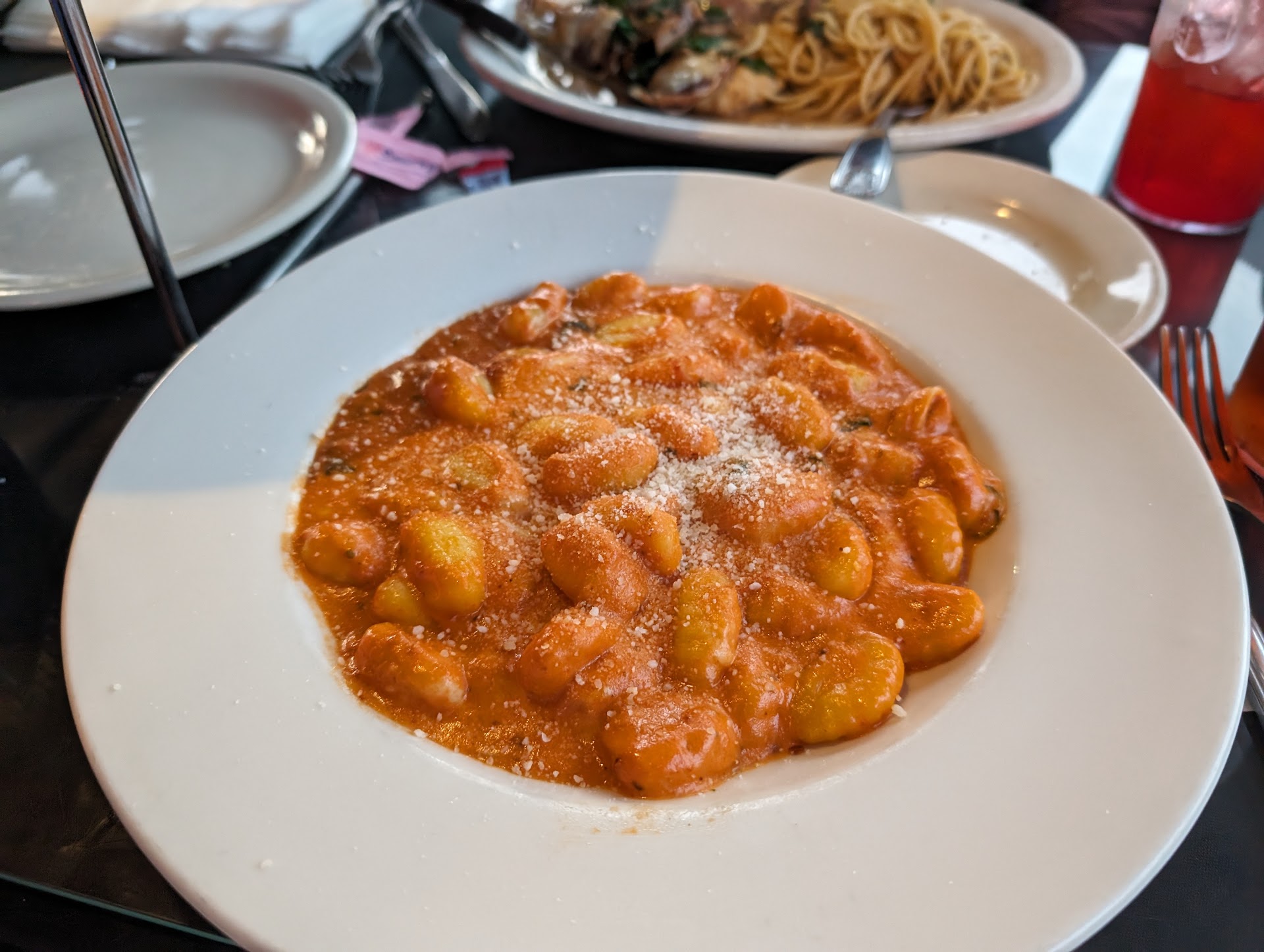 We were escorted to our table and very soon were greeted by our server who introduced herself and passed out menus. She was friendly and attentive throughout our meal. We were a party of four and we each ordered an entree, although we sampled each other's dishes. I ordered Lasagne Napoletana. I received a generous portion which I split with my son. As soon as I took my first bite I was hooked. This was the best lasagne I had ever tasted! My son readily agreed. It was full of flavor and just so delicious! My son ordered Bruschetta Pizza. Three of us ate slices of the pizza and all agreed it was quite good. It's a thin crust pizza topped with fresh, high quality ingredients that tasted great! My wife ordered Pollo Alla Marsala. It's a chicken breast and a side of spaghetti covered with a delicious mushroom/Marsala wine reduction sauce. I did get to taste some of her meal and it was fantastic! Very full, satisfying flavor. The other guest at our table ordered Gnocchi Sorrentina. It's gnocchi covered in a creamy tomato sauce. I didn't get a bite of this dish, but the guest who ordered it was quite satisfied.