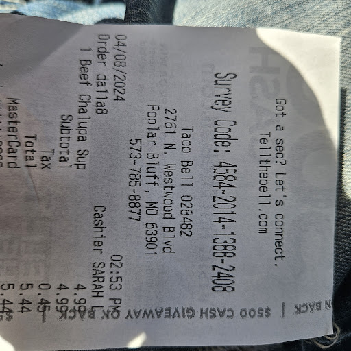Read moreYou get Zero Stars only gave you 1 because it won't let you post with None. So today I got the Double Chalupa, on a to go order when I got to the house to eat it Bogus !! đ. All I received was a Double amount of Chalupa Shell and minimum amount of Filling. And it wasn't random because I ordered 2 of them and they both Sucked. Either the Taco Bell staff didn't understand the reason for a Bigger size Shell or As usual they Are just Too lazy to Make More filling. I've been eating Taco Bell since the Early 70's and the Two In Poplar Bluff Missouri Are By Far the Top of the list for The Worst Service And The Most Pitiful example of a otherwise enjoyable fast food product. Some of us Regular taco Bell patrons actually Show up to eat Being Sober and expect to Get A product that Is Advertised as DOUBLE THE SIZE OF THE NORMALLY SERVED PRODUCT. Two orders combined did not even come close to what One Double Chalupa...