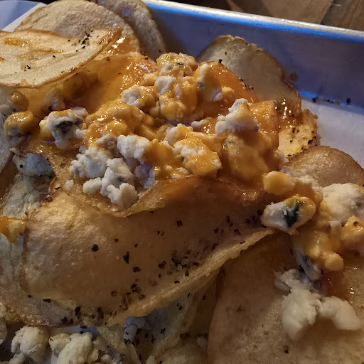 Brittany gave us a few minutes to deliberate, and we decided on our order- onion tanglers as an app, the bourbon proof burger, and the chili cheese burger. Each burger comes with handmade potato chips. We asked for the garlic parm chips as a replacement with one of the burgers, but were told that they are appetizer only. Would have happily paid an up-charge, don't know why this wasn't an option.