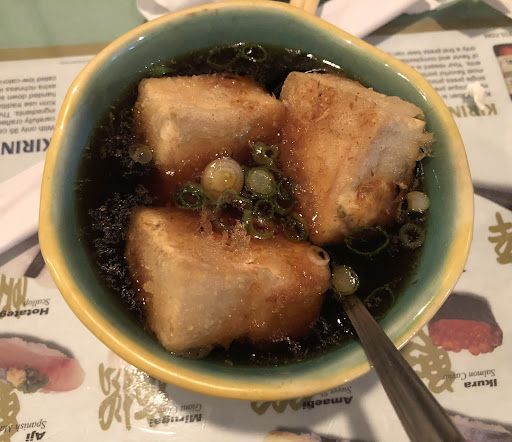 I ordered chirashi, miso soup, and hot green tea, which is my standard order at sushi restaurants. The chirashi was excellent. The fish was fresh and very high quality. The salmon was especially buttery. Each piece was surprisingly large, although the cuts were somewhat uneven. The dish also included mackerel, which is a welcome sight for sushi regulars, but uncommon in this region. It lacked pickled vegetables and octopus, but I would forgive them for that, given the quality of the other portions.