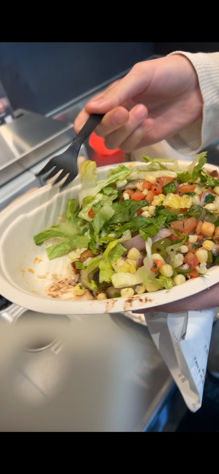 We continued with our order anyway picking amongst the items that were available and left with our food. When we got to our hotel across the street and started eating it became clear that some of the items had been out for a while. It wasn't inedible but it's certainly not what we were used to getting from Chipotle and of course since a couple of things we usually get, like the lettuce, were missing that didn't help the experience.