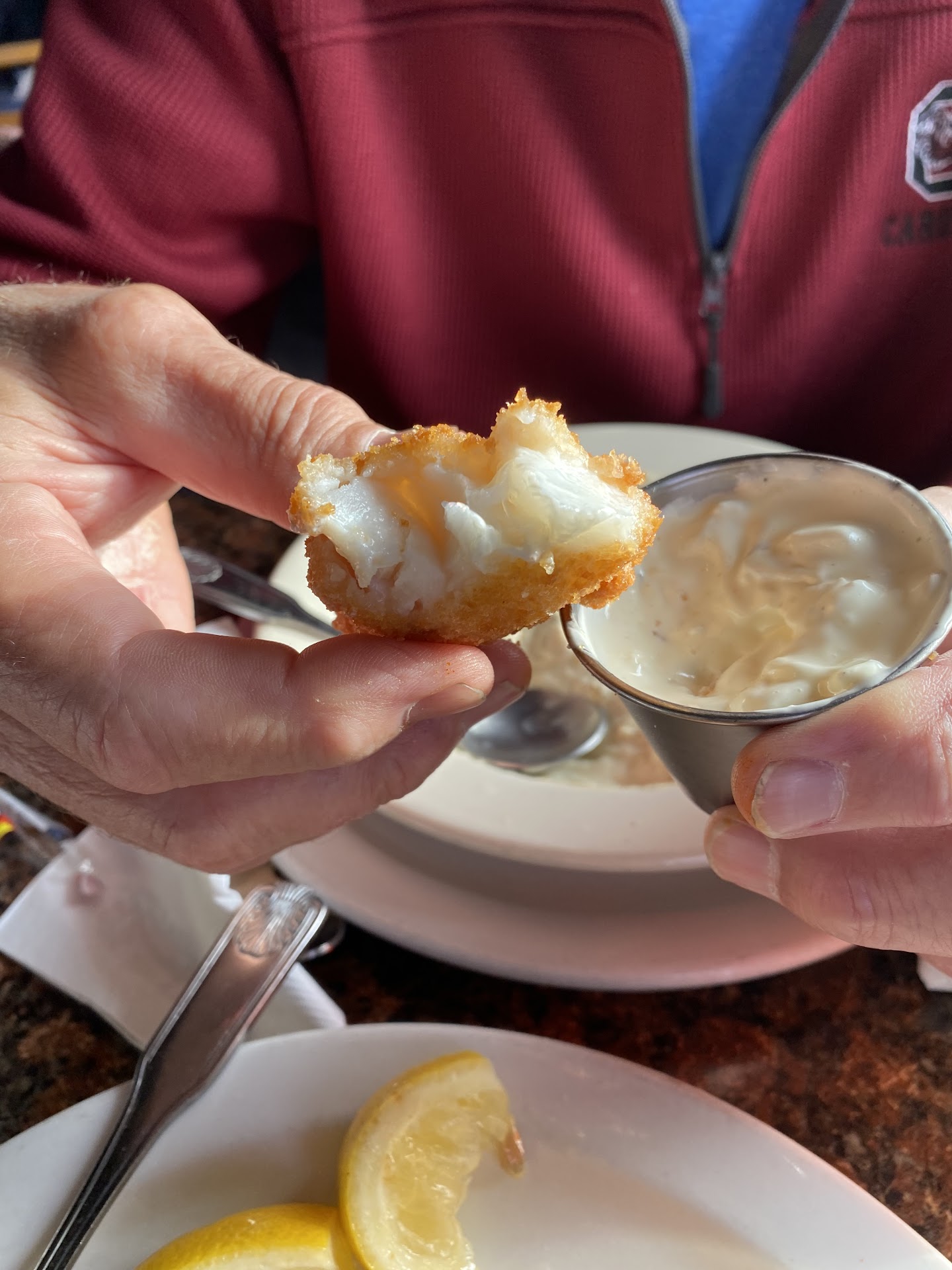 As for my main dish. I ordered the cod fish and chips. As appetizers go I was hoping the main dish would push a striking difference but I was sorely mistaken. The cod was overcooked and instead of a nice delicate flaked fish it turned to mush in my mouth with a flavor as though it had been sitting a while waiting for some one wanting to eventually order it. Over salted and over battered mixed with overcooked left me feeling overwhelmed by confusion when eating in a establishment that was told to be a seafood bassed restaurant.