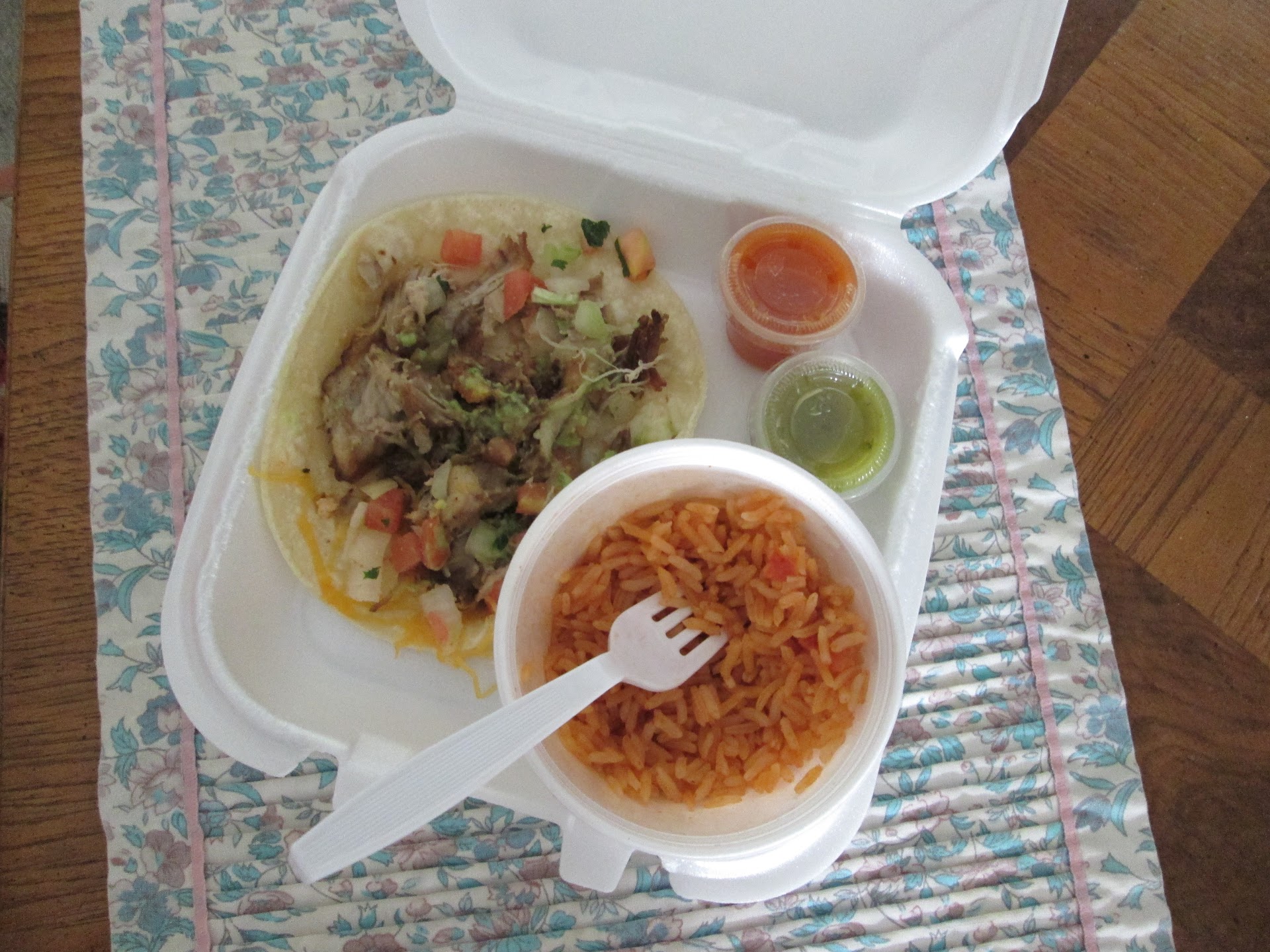 Read moreOutstanding tacos at my first visit. Using their drive-thru, I had one taco carnitas that came with two soft mid-sized corn tortillas and a generous amount of meat, avocado, tomatoes, lettuce, etc--enough for 2 meals. The meat was tender and hearty chunks and had a mild flavor, including 2 small containers of extra sauces on the side. The side order of spanish rice was fluffy and delicately flavored. The chicken taco had a crispy, fresh corn taco and lettuce, tomatoes, cheese with fresh shredded chicken white meat that was delicious. All this in under 5 minutes for only $10.25. This is my first time and it seemed like the food was more natural and homemade, similar to that in southern California at a taqueria. I will be back. It was only about 10:30 am and no waiting in line. This is an edit to my first review: The service is still good and portions are generous, but the last few visits I had cold tacos and the double layer of tortillas stuck together so I could not separate them to make two tacos. The potholes in the parking lot have gotten worse since my first visit. I won't...