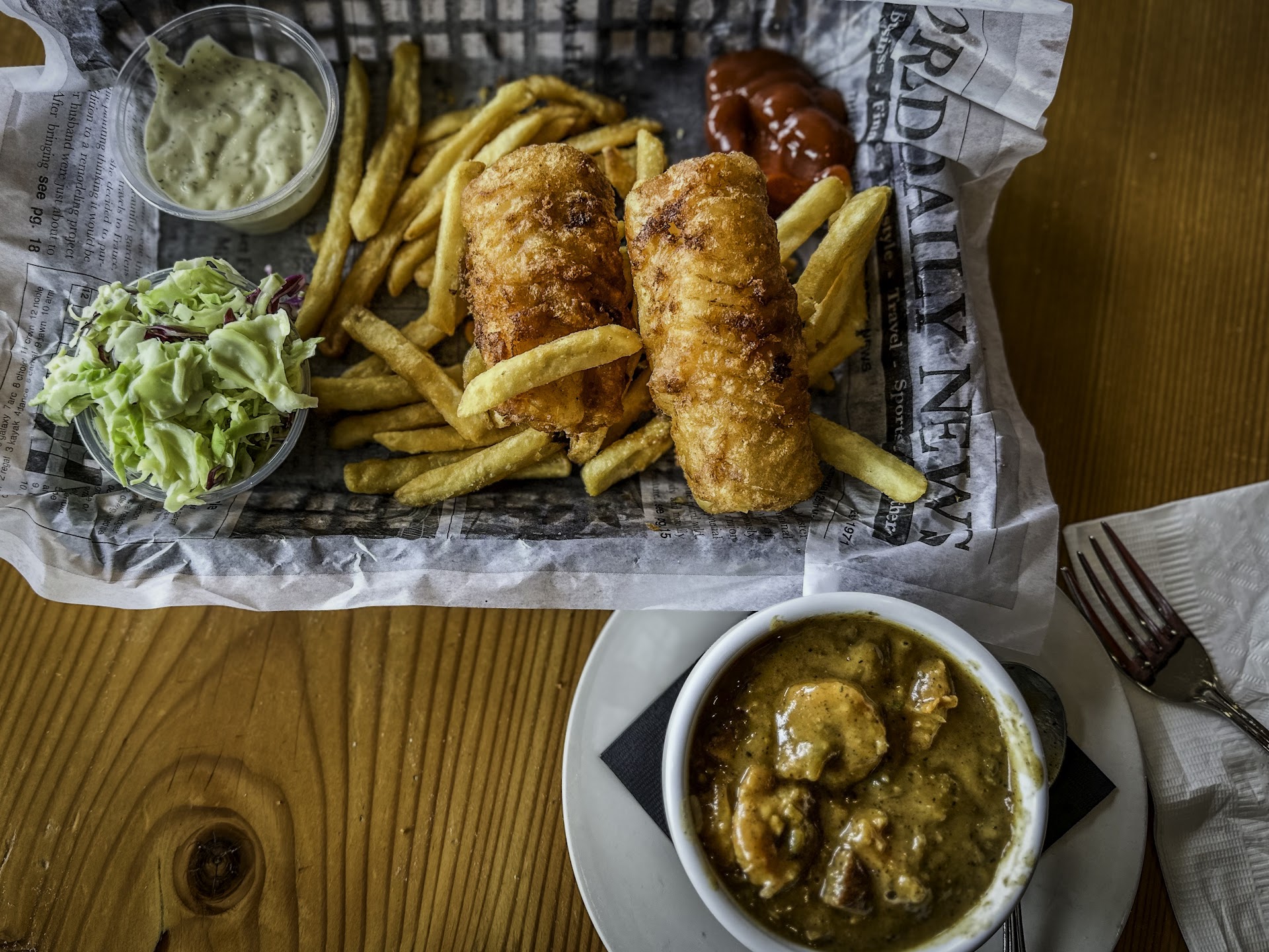 Pacific Cod Fish and Chips with Coleslaw and Authentic Gumbo: