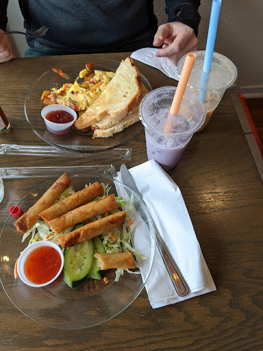 This is place is an adorable small American/Filipino cafe. Featuring menu items heavily on the American breakfast side. With breakfast being served all day. There are vegetarian and vegan options as well. They have an extensive coffee, boba, and smoothie list Pros: owners are genuinely kind people, the food is delicious We got the chorizo scramble with sourdough and the lumpia with turkey. Both were hot, made fresh and amazing. We tried the passion and taro bobas which are classic and solid Staples of the boba world. We will be back, and I would strongly recommend this place for breakfast, especially if hungover.