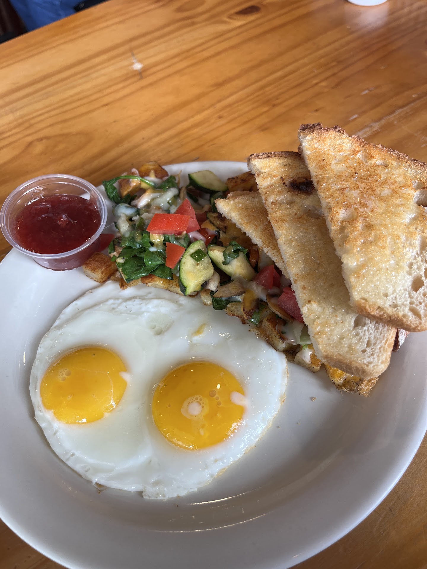 I had the âavocado toastâ which was a very lightly toasted piece of bread with store bought guacamole on it, and two slices of unripe tomatoes with the cores in them. My egg was cooked correctly. The âtoastâ was absolute mush everywhere except the very outer edge.