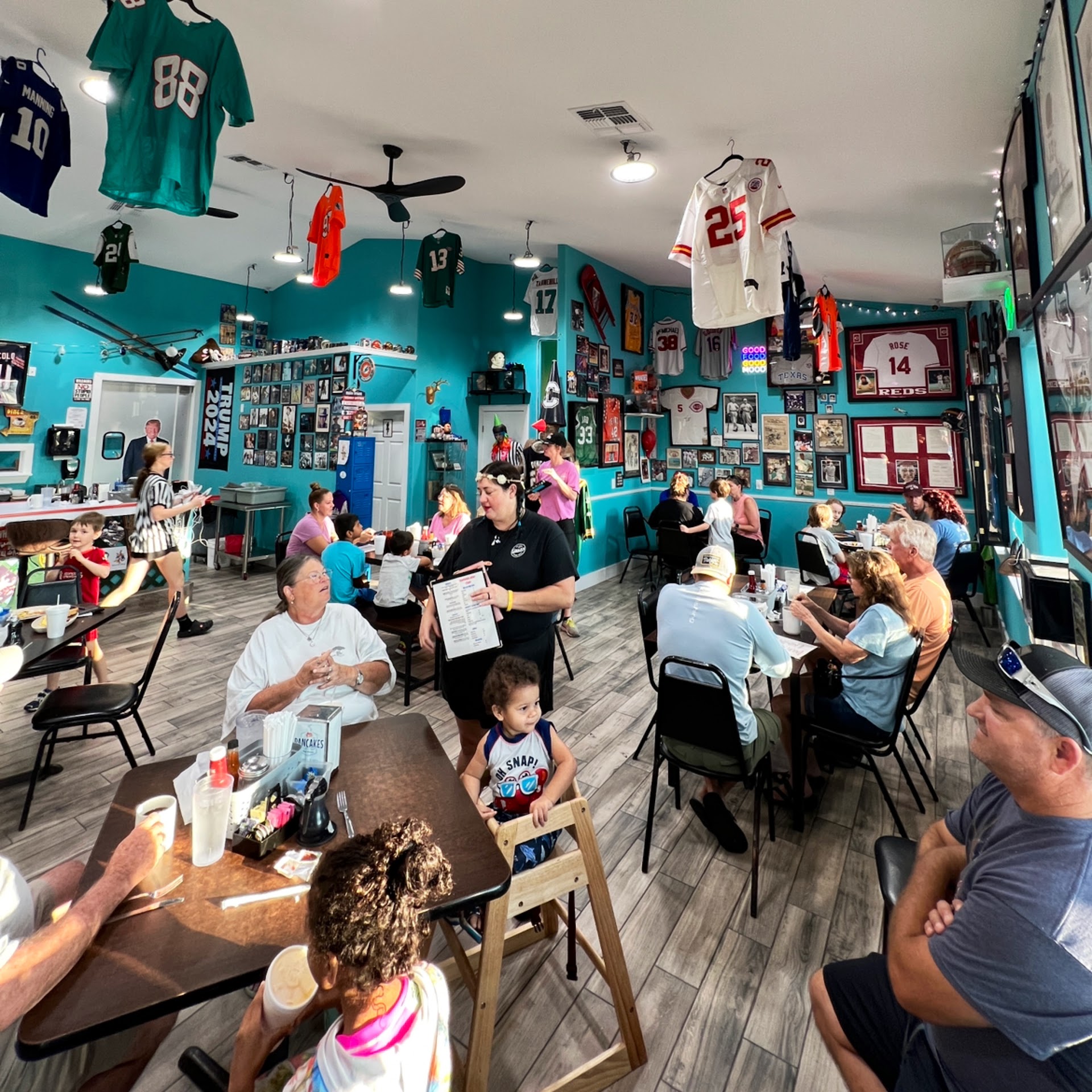 I'm a big breakfast lover and came in looking for breakfast before hitting the beach for a friends 50th bday. Place has some amazing sports related items all over the wall, along with alot of Americana which I appreciated (if your patriotism is questionable...eat outside or go elsewhere less you might hurt you feelings). Small place, just my kind of establishment, smelled awesome, greeted immediately by a friendly face, and got a seat without a wait.
