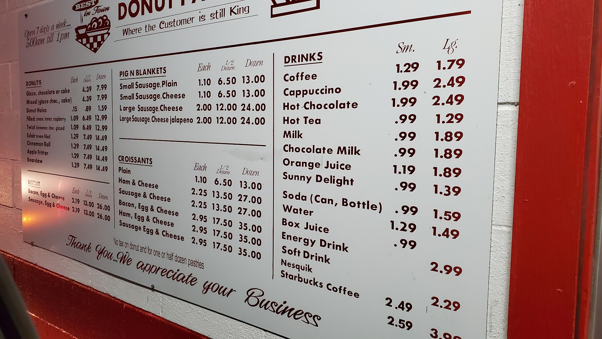 Read moreSent daughter in to get a dozen donuts this morning. She ended up picking out 14 so clerk suggested getting 4 more to get 1/2 dozen price, so she did. Total was over $43 and after she got back to the car she thought that was a little high. Menus says $20 a dozen, $10.50 for 1/2 dozen. Daughter went back in and clerk asked for receipt even though they had just left and were not even given a receipt. Got a total of 18 donuts. Clerk did admit to accidentally charging for a dozen donut holes that we did not get so gave daughter $2 back. It seems that we were charged for 2 dozen donuts when we only ordered and received 18....