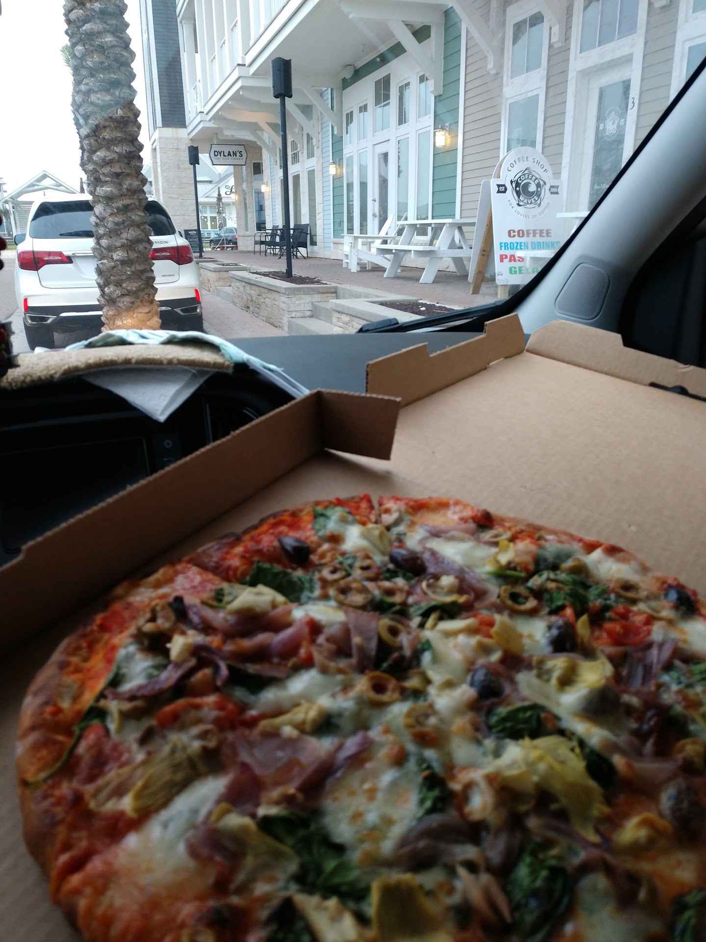 We looked Dylan’s up on Yelp before heading there, after our dolphin watching excursion. They had great reviews, we wanted pizza, so that’s where we headed. Since we arrived at 8:36p and had seen that they close at 9, we thought we’d help THEM out and not still be there and be a burden past 9, when they close. So we ordered our food to-go.