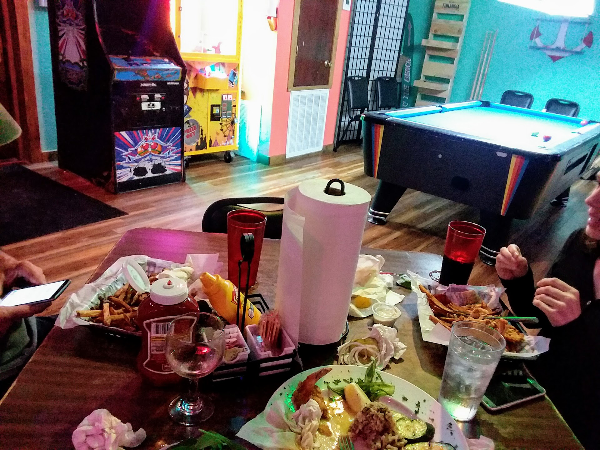 Read moreIf you read anything about this restaurant in advance, expect to be disappointed. The website promises great food and family fun.In reality, it’s a dimly lit bar with two empty claw games, a Galaga machine with a table in front of it, and a covered pool table. There was some very basic mini golf out front. We reviewed the menu on the restaurant’s website before deciding where to eat. Hubs had decided on a ribeye served with bleu cheese mashed potatoes and fried asparagus. I was torn between scallops and crab legs. Turns out none of those is on the current menu except the fried asparagus; the woman at the counter said the website menu hadn’t been correct in three years. So hubs ordered a Grouper basket ($19.99), which he enjoyed. I ordered a crab cake ($6.99 up $2 from their website menu) and fried asparagus ($9.99 for five spears, up $3 from the website). The crab cake had good crabby flavor, but was too spicy to enjoy more than two tiny bites. The fried asparagus was either canned or overcooked; it was mushy under the crispy breading which, if served alone, would have been the best part of the meal. Besides being more bar/hangout than fun family restaurant, Kody’s was not the kind of place we would return to. We ordered at the counter and seated ourselves at a table against the wall. We sat for a few minutes before hubs looked up and asked if I was being dripped on. I looked up and sure enough, the air vent above me was polka dotted with condensation. Thank goodness the place was only half full (at 6 p.m. on a Friday night in July), so the table options were many. Since the restaurant we’d gone to Wednesday evening had a two-hour wait, we...