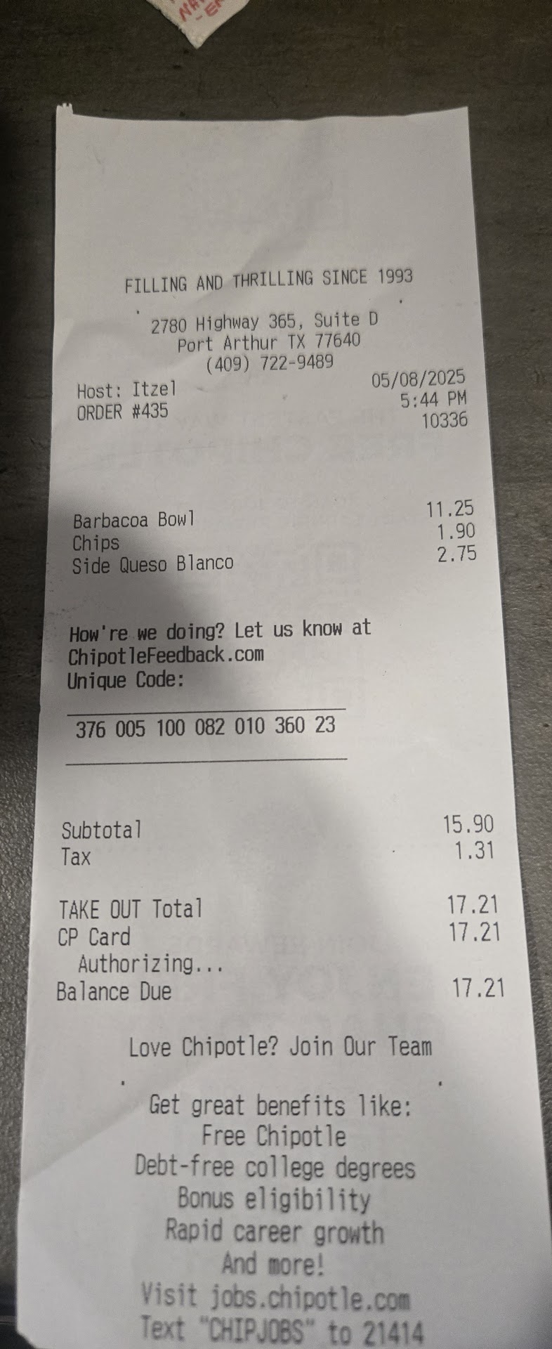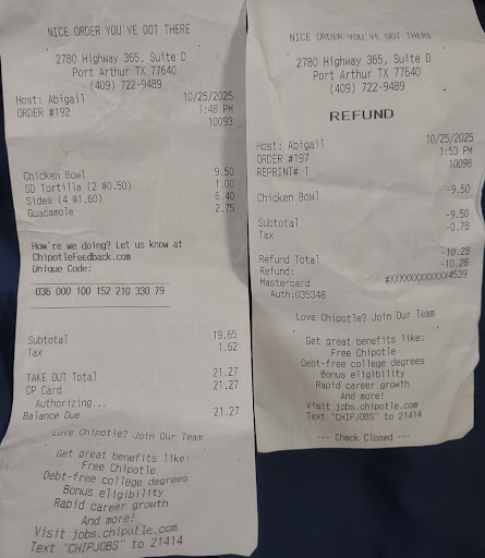 Read moreSooo, I travel for work. I am out here in Port Arthur every week and on Monday's, I get Chipotle. This is a routine that I have and had have for the last 3 years. Today, I made my usual order, which is a bowl and i get chips. My order is ALWAYS the same thing. To clarify I scoop my bowl with my chips. I don't, can't and WON'T eat my bowl any other way. To me it's like eating cereal without milk! Well, today they forgot my chips and I didn't notice until I got back to the room. Since I can't eat without the chips, I drove back and explainedthe situation. I also asked if they could remake the bowl since it has been about 45 minutes since I ordered. The integrity of the food has definitely changed (soggy cereal now). They told me that they can't remake the bowl and they were sorry! The way I see it is, if they had given me what I paid for in the first place I wouldn't have had to drive back. I got no compensation whatsoever. Not that I wanted any, I just wanted to eat my food the way I like it, who doesn't! I did, however, get the chips. Which I should have gotten in the first place and would have avoided this whole situation. I guess this is how business is done these days. I will accurately rate the location tho, I can't 1 star based on today....