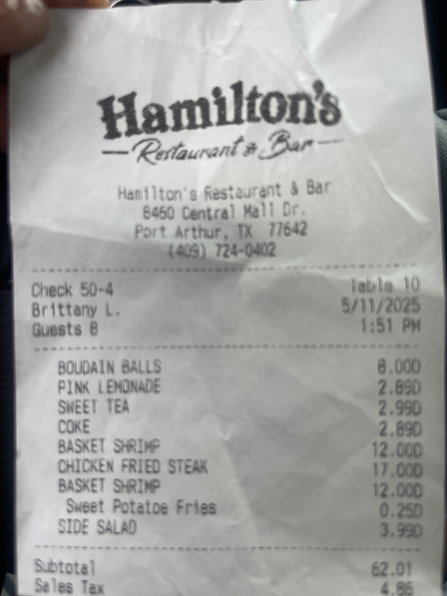 Read moreI went to Hamilton’s on Mother’s Day for the first time. It was nine of us. We arrived about 11:45 and the wait was about 30 minutes. Our service started off okay. Then my son picked up his half eaten roll by a long strand of hair. I discretely showed our waitress and she just brushed it off and said she would get us some more bread. I declined her offer. Nothing else was said about it. No manager approached us. Nothing. (I should’ve took a picture of it.) Well our food was good. I do believe my 18 year old son got food poisoning. As soon as we got home he was on the toilet, back and forth. Then that night he was vomiting. It was bad coming out both ways for at least 24 hours. We kept him hydrated and he finally ate again Tuesday evening (a plain baked potato). He is the only one who had an appetizer of boudin balls. Maybe they sat out, maybe the meat was bad, maybe it was spoiled. Anyhow I will not recommend Hamilton’s to no one and will never go again....