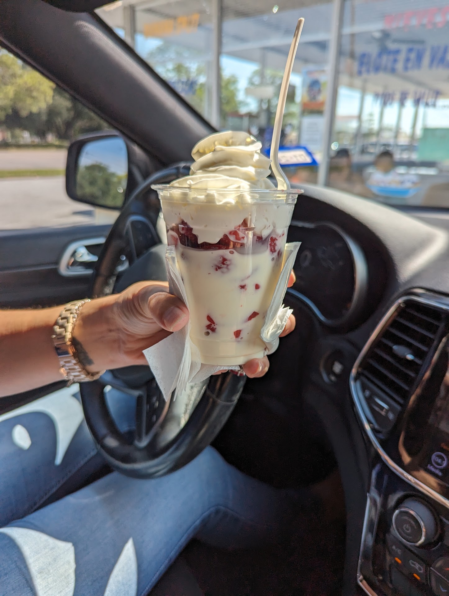 I've seen this place here for a long time but always passed it by..even though it's hard to ignore the lettering and colored papers used to advertise this business. EVERYTHING is in Spanish therefor I could not decipher. I'm not sure how to say the name of the business so I have just been describing it or the location when promoting it to my friends. In my head I foreseen myself going into the establishment, asking questions to the employee who only speaks Spanish and getting many blank stares back while embarrassing myself and my children. BUT I'm glad we took a chance because it was marvelously superduper awesome and please note... KID APROVED! Nowadays kid approved is very hard to come by. ICE CREAM... CUP OR CONE.. here is the greatest thing about this... $3 for a small (little more than 1 scoop) ON A CONE of u want! $4 medium(2 scoops) $5 LARGE (3 scoops) ON a CONE or in a cup. DANG! Is that good or what? I paid $5 for one can soda in Galveston a little while back. And they have a variety of flavors. We went through the drive through window and the guy working was very nice, helpful and put off a happy/good vibe....