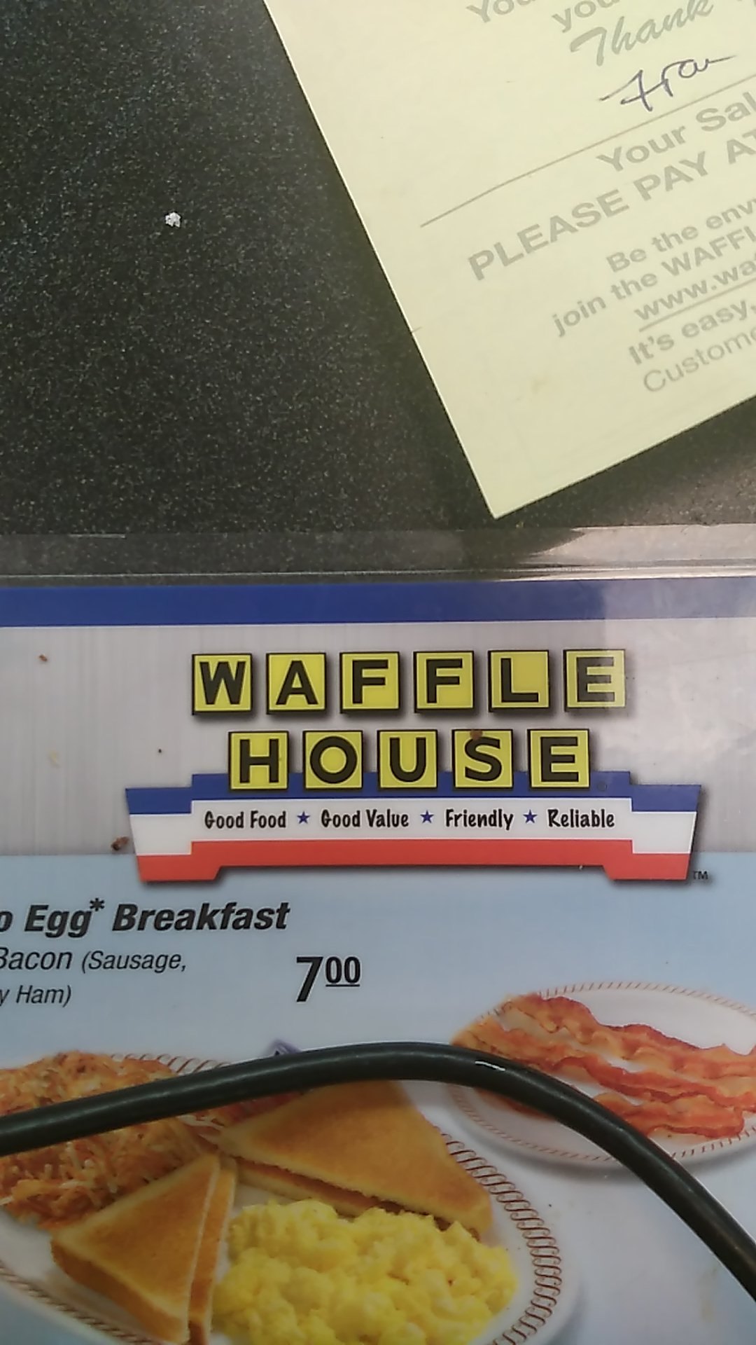 Read moreOur waitress named Bella made our experience horrible. She has a rude attitude, and no kind of "Hi how are you guys doing today. I'm Bella and I'll be your waitress?" When we got our plates and my husband cut open his eggs over easy and they were RAW and she told us that over easy and over light are the same thing and that they were supposed to be raw (keep in mind that we always go to Waffle House when we get the chance), She Never asked if we needed a refill on our drinks and my husband and I sat there waiting. Then she came while we were still eating and asked if we were done eating like " Noo!" We felt rushed the entire time. On the upside the Table washer was very respectful and nice even though my daughter made a mess so I left the table cleaner...