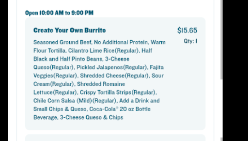 Read moreUsed the online order service, was informed my food should’ve been ready between 11:50 and noon. Walked in at noon expecting it to be set to go, but even though there were only two patrons dining in and nobody currently ordering, I still had to wait close to ten minutes before it was ready. At least I wasn’t alone as there were two others also waiting for their pickup orders. Got home and was so excited considering we haven’t had a Qdoba near us and haven’t been able to get it for years only to be disappointed by food that tasted like it wasn’t seasoned and two missing sides of hot salsa. I understand you’re freshly opened, but this doesn’t exactly make me want to go out of my way (about a 30 minute drive from my house) to get a meal...