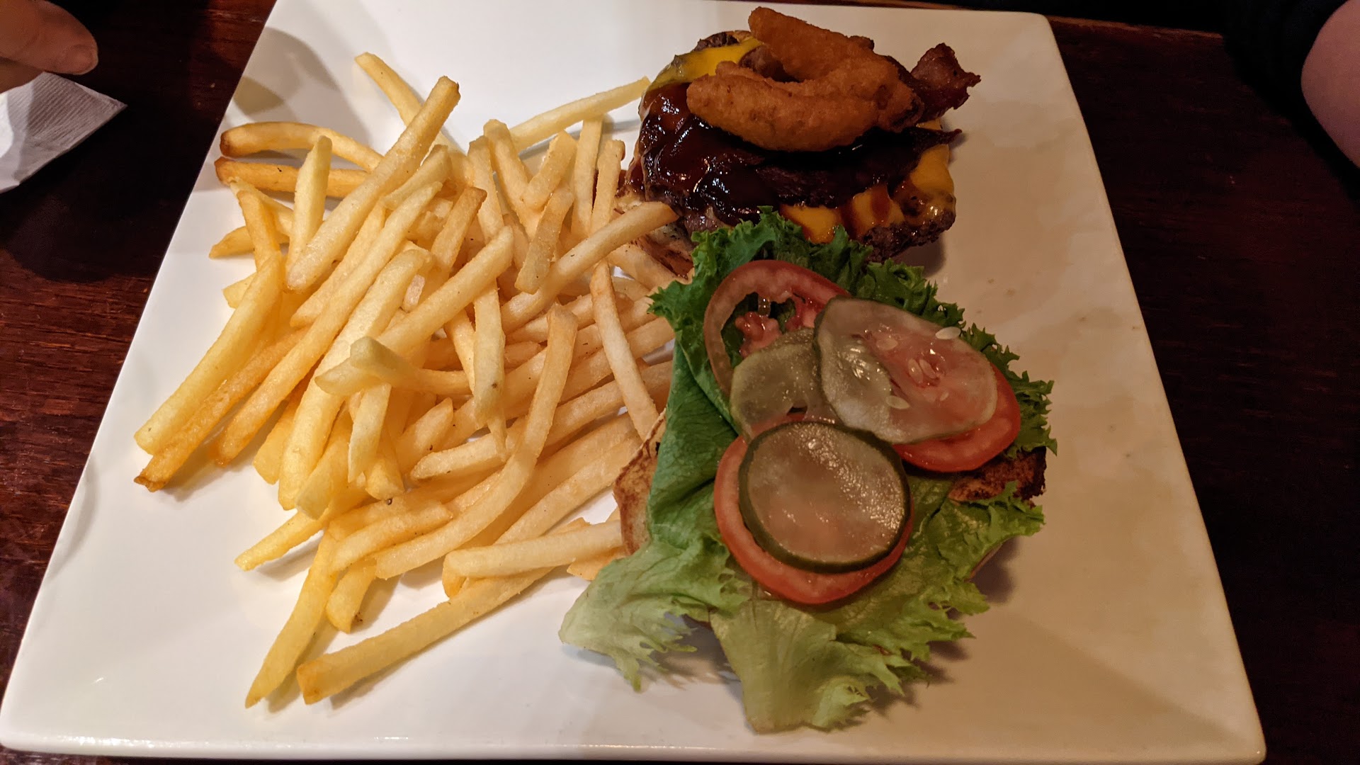 My husband and I stopped here for a quick meal on our way home and everything was very good! Service was fast and the food came quick and hot. I had a new Christmas themed cocktail which was delightful. My husband and I shared their reuben egg rolls which were very tasty! He had a burger that I took a bite of and it was good. I had fish and chips which were crispy on the outside and moist on the inside, very good! Overall everything exceeded our expectations and we were very happy with our meals. We'll definitely be back when we're in the area.