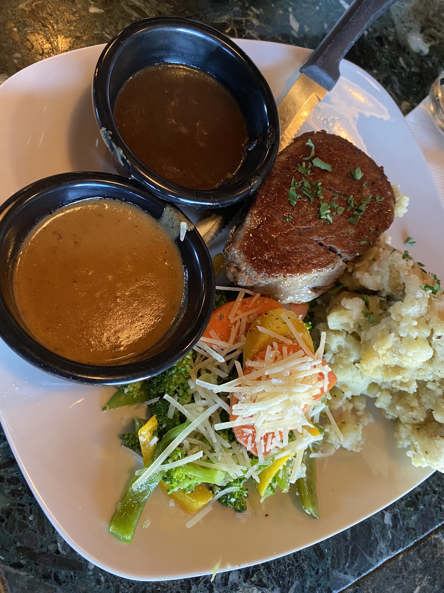 The potatoes and vegetables were so lack luster, vegetables were not done enough and still crunchy. The potatoes have a great texture and mix but it is overpowered by the pepper taste in it. The zip sauce compliments these but doesnât overshadow the pepper taste. The peppercorn sauce was delicious but odd, had this sweet taste to it almost like a syrup or Carmel. Not bad but not what I was expecting.