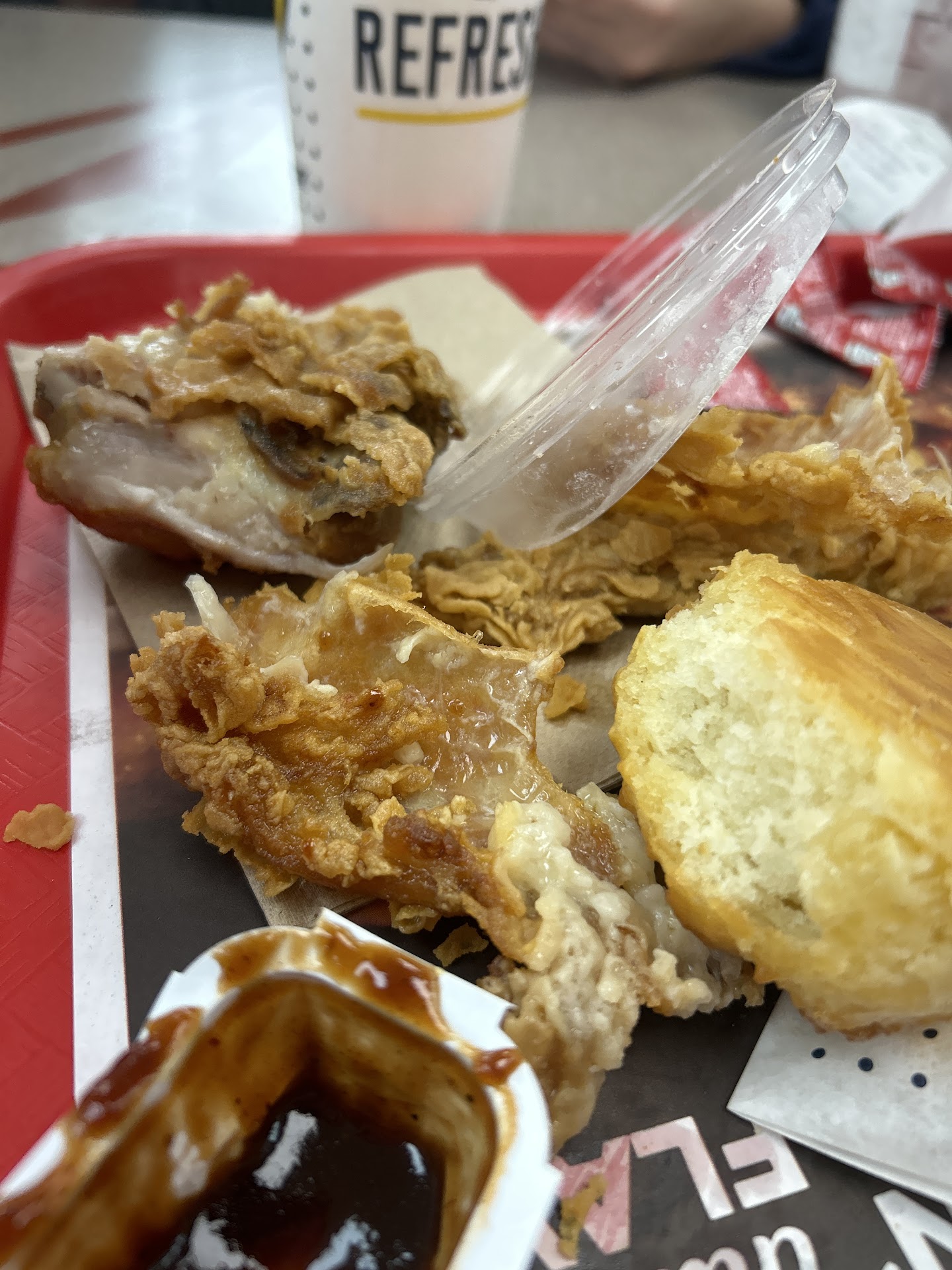 Read moreFast cordial service and they were VERY busy at about 5:40pm. Our first time here, so we were indecisive. After talkjng with another customer, We each got a $4 box. I would have liked to have the spicy instead of plain which was offered with my box, but I took advantage of the cup of jalapeños at the register to spice my meal up, my small French fries were the perfect small amount for me and my 3 piece tenders were good, hot and fresh fried, I gave one to my husband who had the other box. Coleslaw is ok. The biscuits were just put of the oven and delicious! We went in and took our meal to go, honestly Cannot...