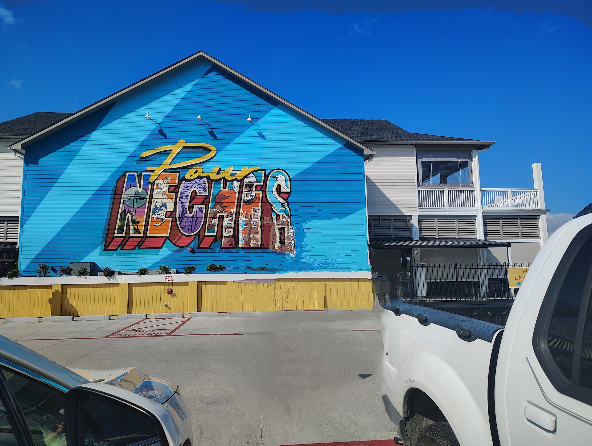 Pour Neches ... PORCH Neches! Felt kinda like hanging out under porch covers (or under beach cabins on Crystal Beach). Open air bar and restaurant on the Neches River and has places for the family to play games (pickleball & ...)
