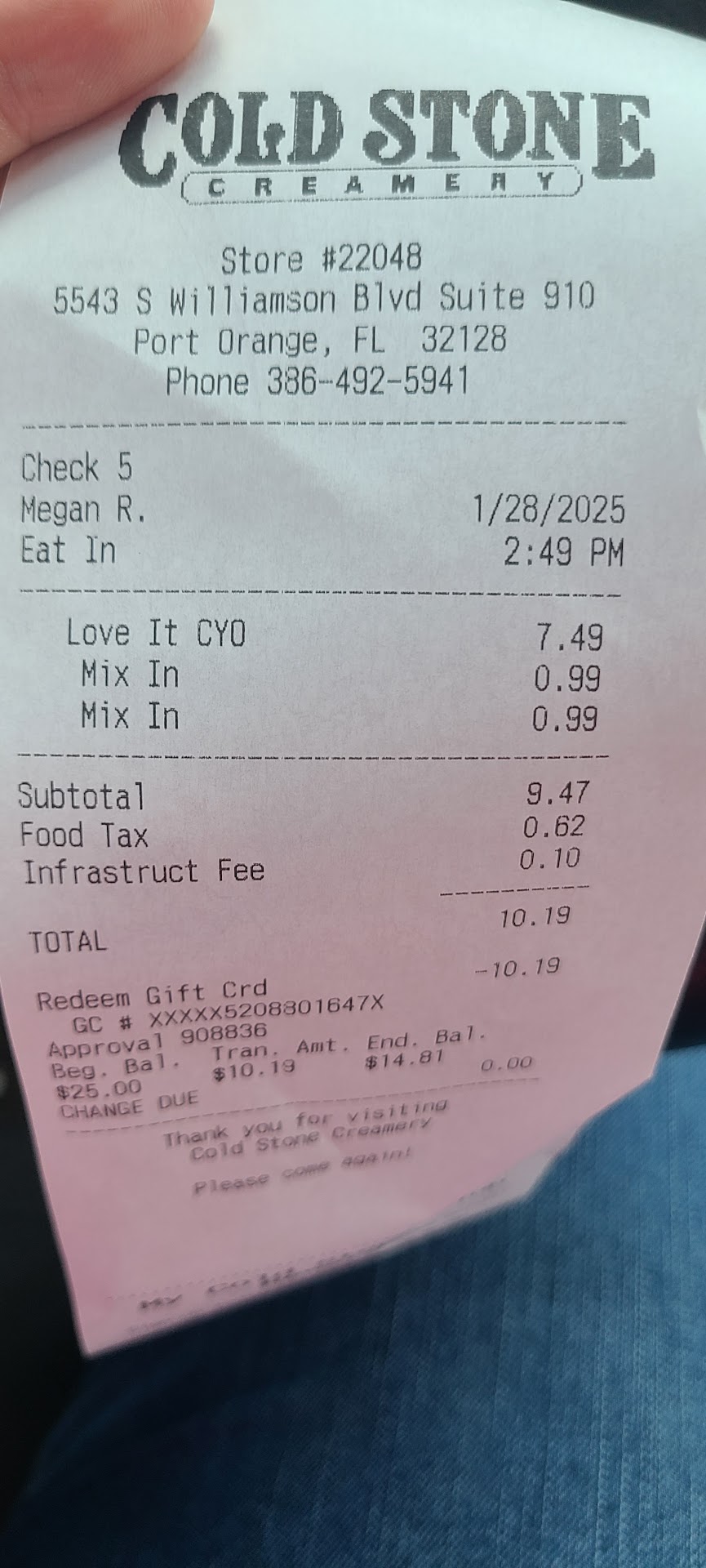 Ok... I thought to myself if we didn't have a gift card I would of walk out right then and there, and especially after you made us wait for so long. But since we already there and had the gift card I let it go. My daughter then asked for a love it size with one scoop vanilla and one scoop chocolate. The girl then stated she can't do that and mix them. Ummm.. isn't that what coldstone is about? So my daughter settled on chocolate ice cream with crunch bar, Twix and gummy bears. Then we we went to pay she acted so disgusted that we were using a gift card. She literally threw it back at me. Didn't offer a recipe, I had to take it from the printer myself. You would think for over $10 for this one ice cream you should be allowed to mix it, have as many samples as you want, and be greeted with a smile and not as if you are bothering someone. I tell you, I will not return once this gift card is used. The place looks like it need a good cleaning and dusting major inside. Save yourself alot of money and just go buy ice cream out of the grocery store. Because this...