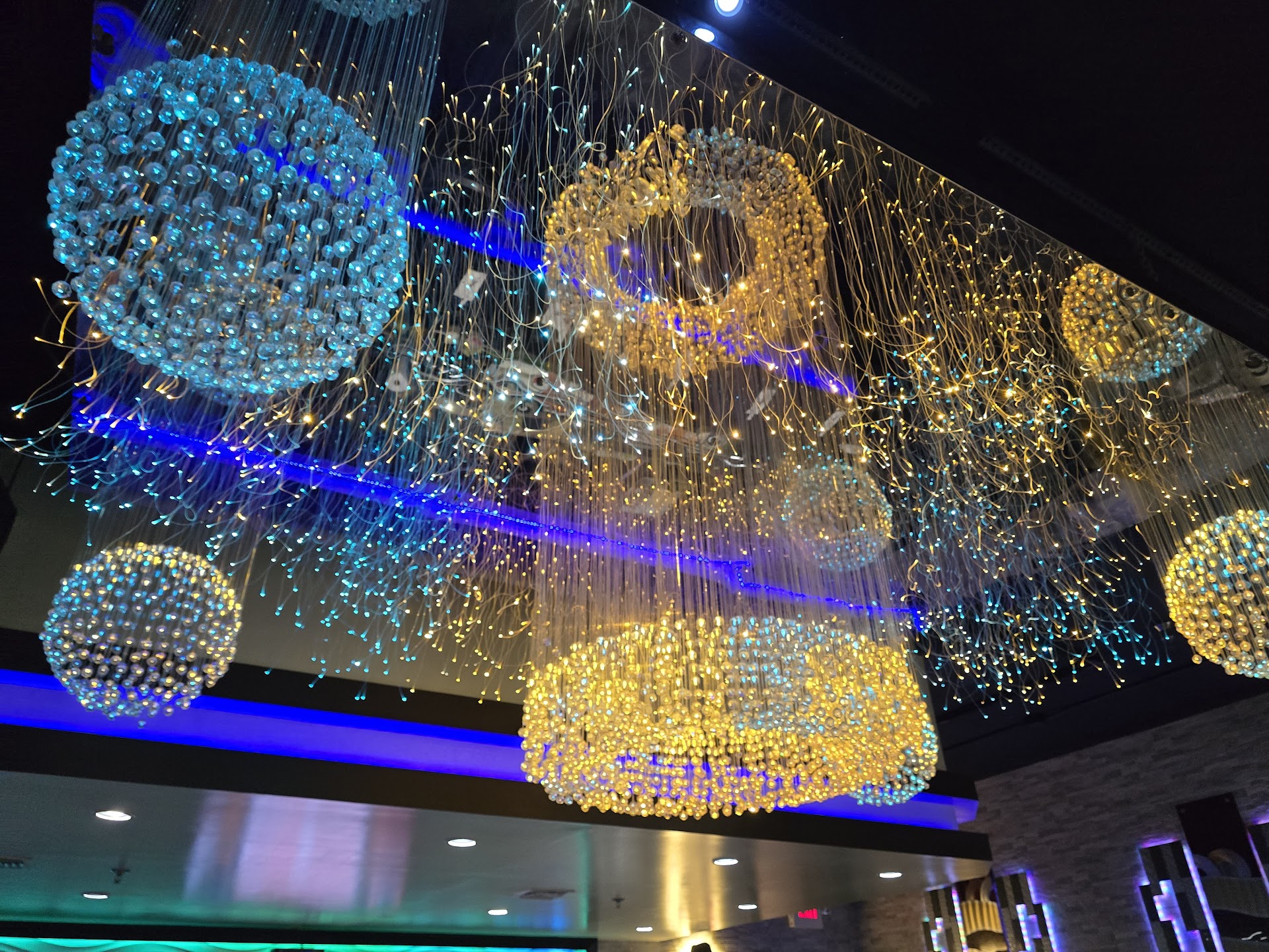 The ambience is beautiful and modern. There is this gorgeous light fixture that changes colors I could stare at from where I was sitting. I captured it in my favorite color pink. Love!! The attention to detail was in everything from the appearance inside to the plates we ordered.